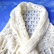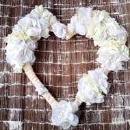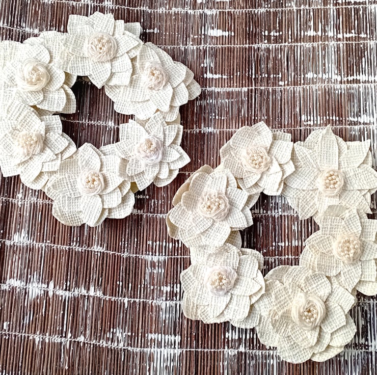 Round shaped wreaths of cream, ivory and white fabric 'flowers' arranged around a padded fabric covered wire frame.