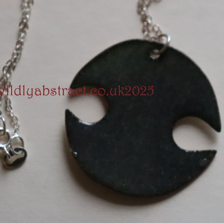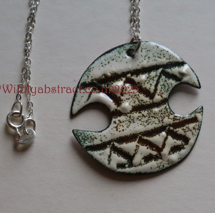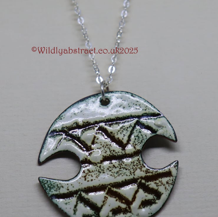 This pendant was handcrafted from copper sheet cut. The copper was coated with two layers of enamel and using the sgraffito technique an aztec design scribed into it. The pendant was fired in the kiln, fusing the enamel to the copper. It is counter-enamelled on the reverse. The pendant measures 3.5cms x 3cms and is suspended from a sterling silver chain, with a total necklace length of 25cms.
