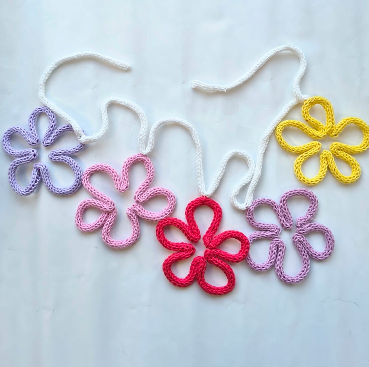 If you love all the flowers and want to decorate a room with the prettiest of decorations, this flower garland is for you. Each of the 5 flowers is a different shade of cotton yarn and they hang from a subtle white knitted cord.