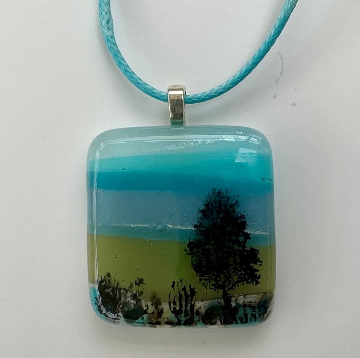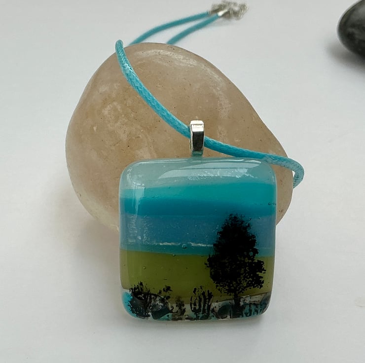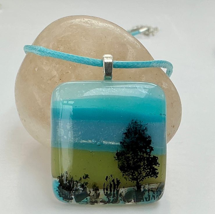 Fused glass pendant necklace depicting a view out to the ocean, with a tree set on the foreshore. Created by layering up narrow strips of carefully colour graded art glass to represent a rocky shore set before a sparkling sea and vivid blue sky. The strips were fused to a white base and kiln fused, then refined by hand-sanding before adding more detail to represent the grasses and tree in the foreground and fusing again. A statement piece of jewellery, measuring 30 x 30mm, the pendant has a matching adjustable turquoise blue neck cord (adjustable between 17 - 19")