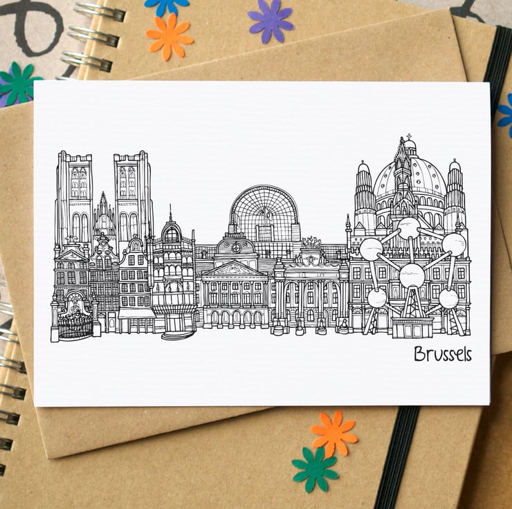 A blank card featuring a skyline illustration of some of Brussels' most iconic landmarks.