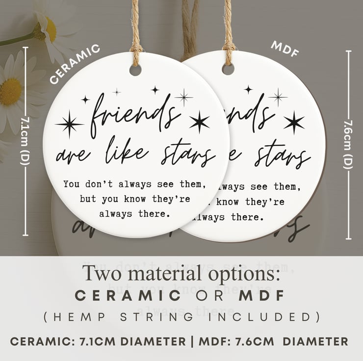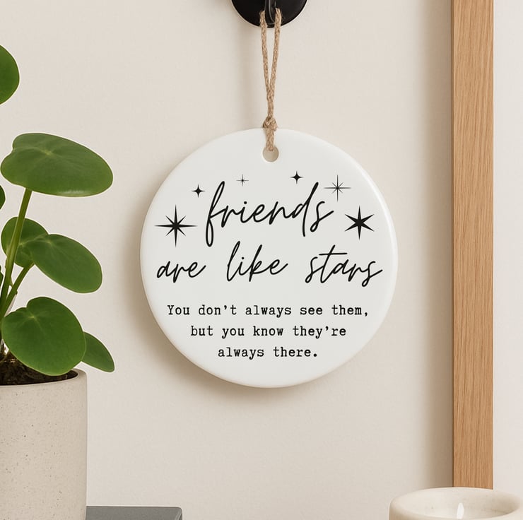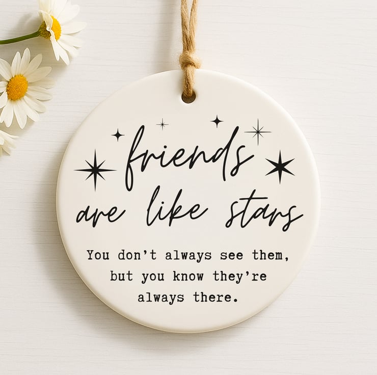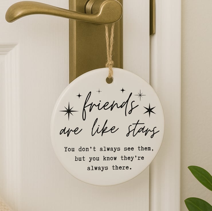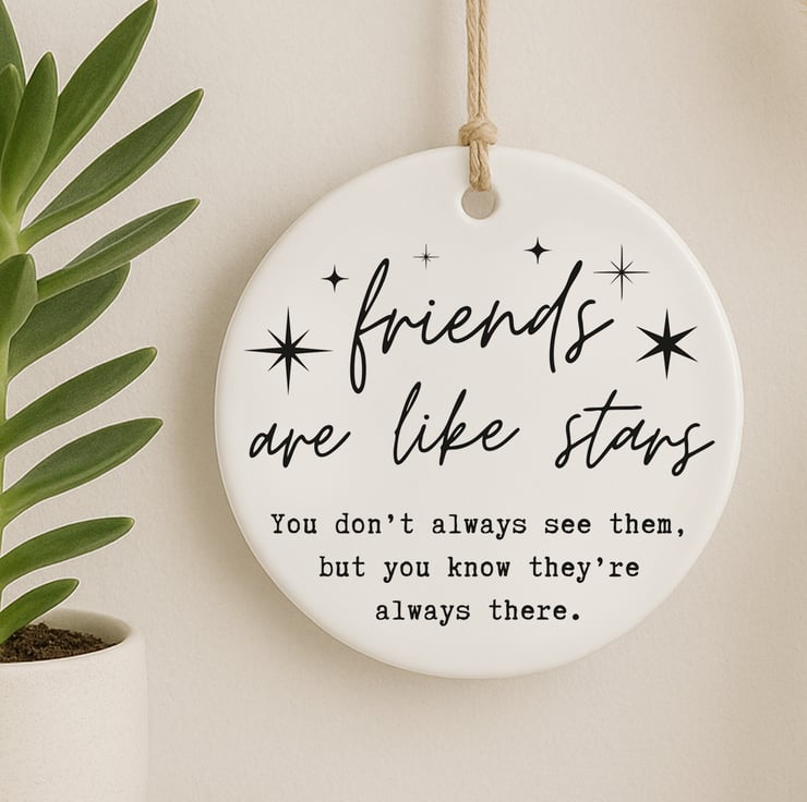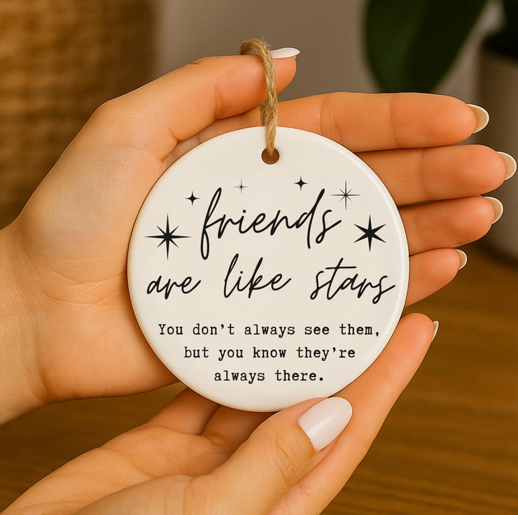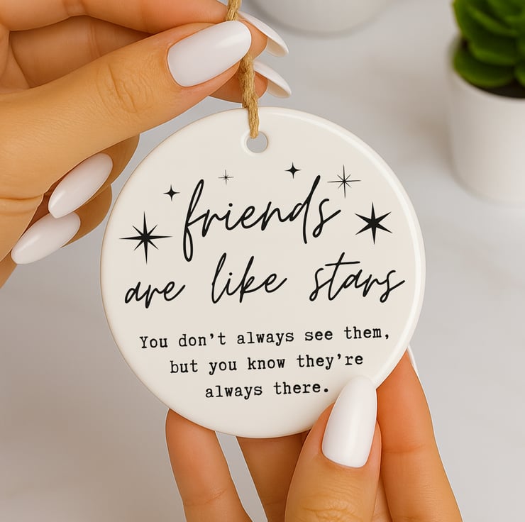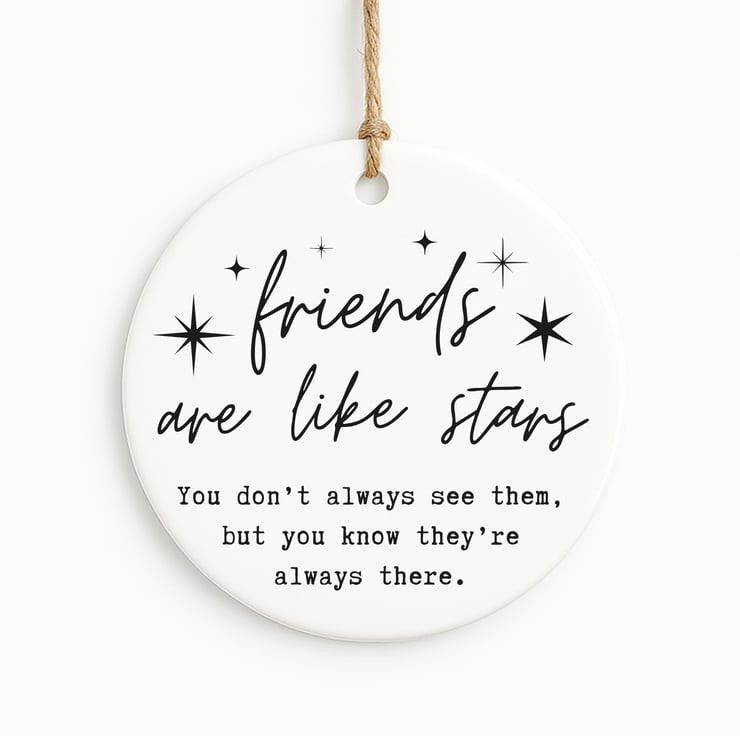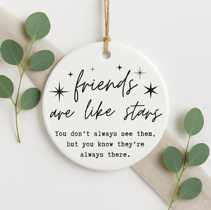 This Friends Are Like Stars ornament is a sentimental friendship keepsake that captures the comfort of knowing someone is always there. Featuring elegant script typography with star details, it’s perfect for celebrating meaningful connections.
