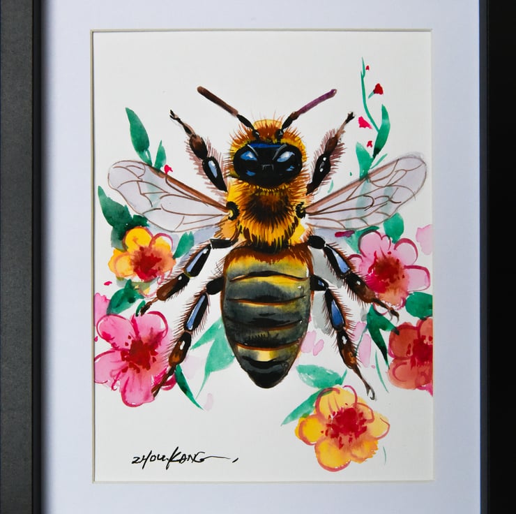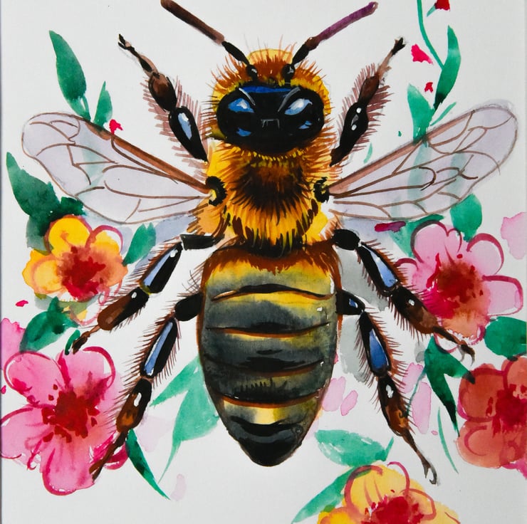 An original watercolour painting of a bee painted on high quality paper. It is a fun and amusing take on animals and will surely bring smiles.