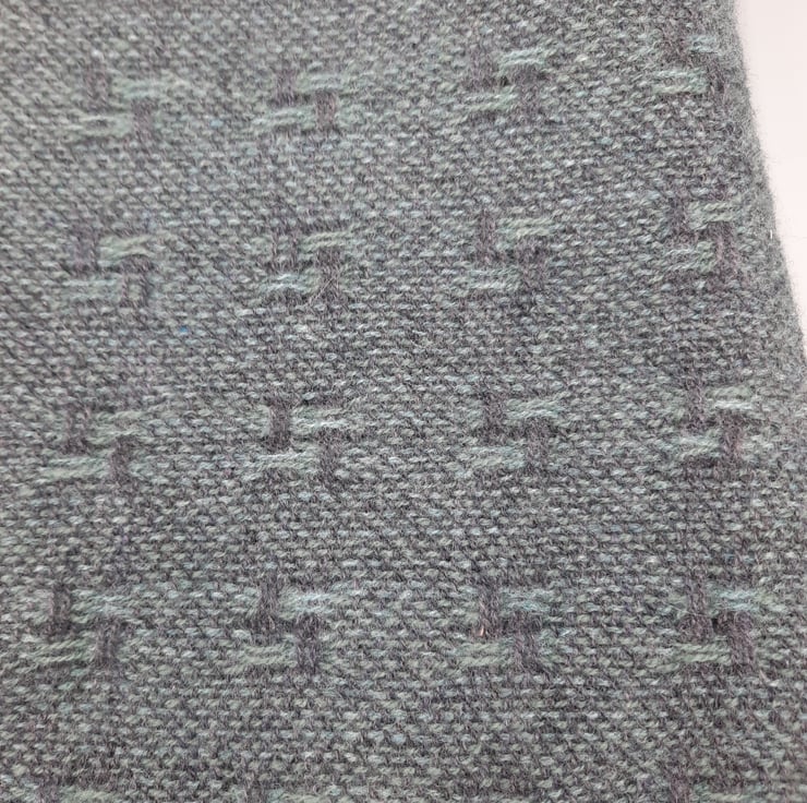 The warp is a soft duck-egg blue while the weft is an almost-lavender grey and tiny dotted stripes of natural white highlight the selvedges.