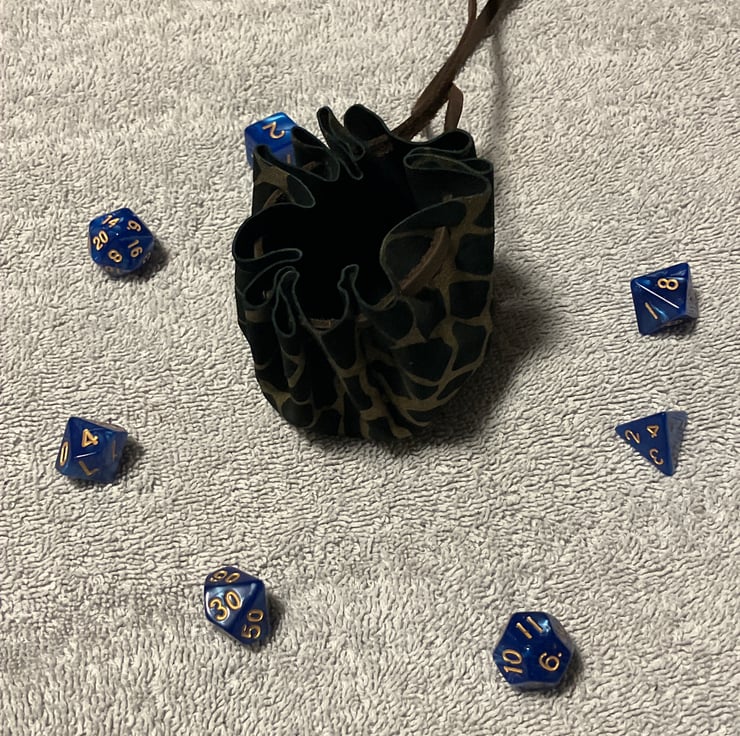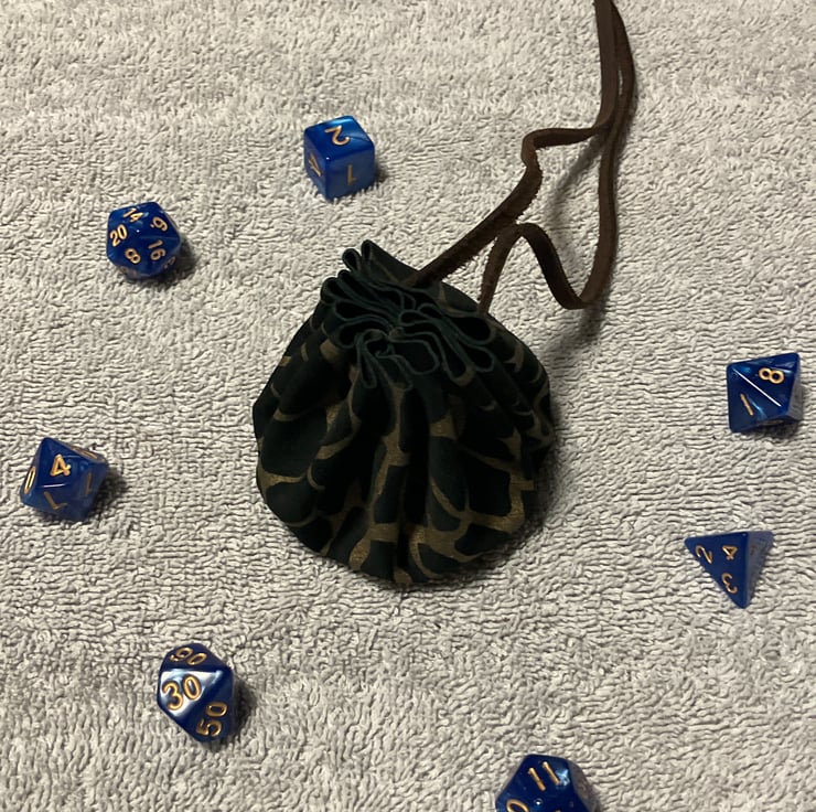 The pouch is small, but big enough for at least 3 sets of dice (if you have 7 dice in a set). It’s a great size as you can toss it into another bag or tie it off on a belt for easy transport.