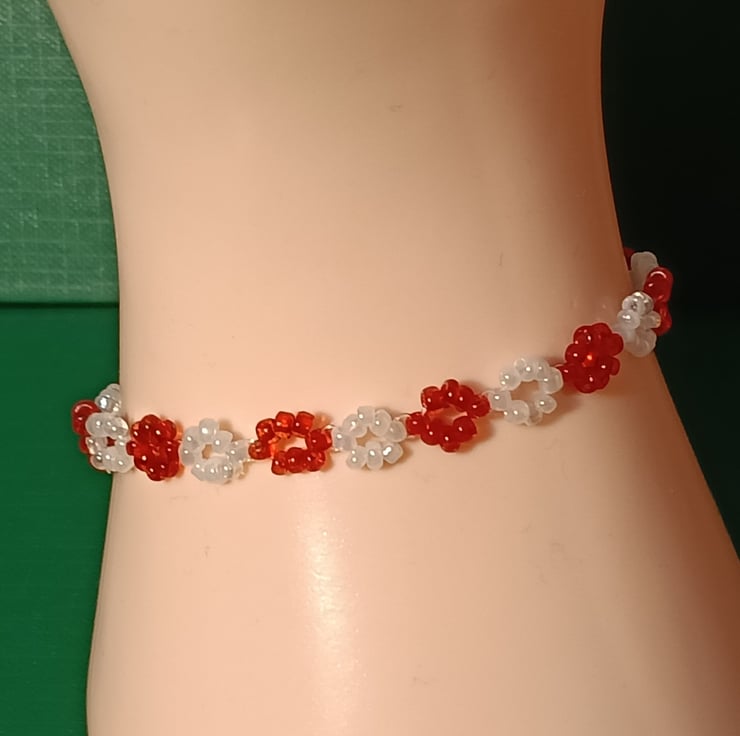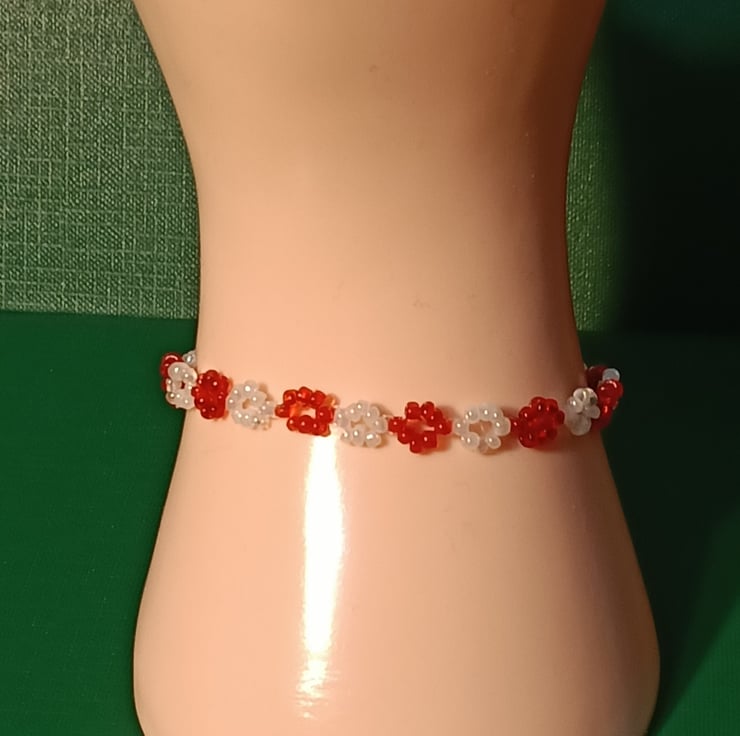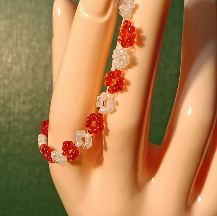 This unique piece is made with 1mm red glass beads and 1mm white glass beads .