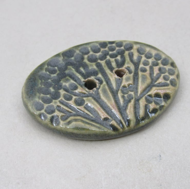 Medium oval shaped stoneware button, textured with a seedhead motif. Finished with a glossy dark green glaze