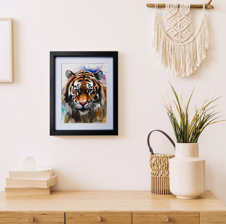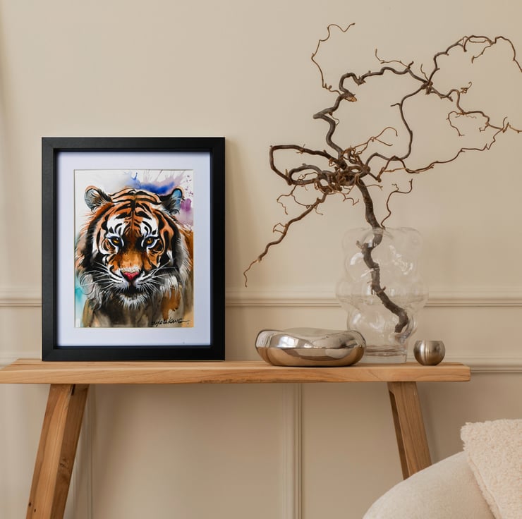 An original watercolour painting of a tiger hand-painted on high quality paper. It is a fun and amusing take on animals and will surely bring smiles. Thoughtfully made and one of a kind, it makes a perfect gift or present for birthdays, anniversaries, special occasions—or simply to brighten someone’s day.
