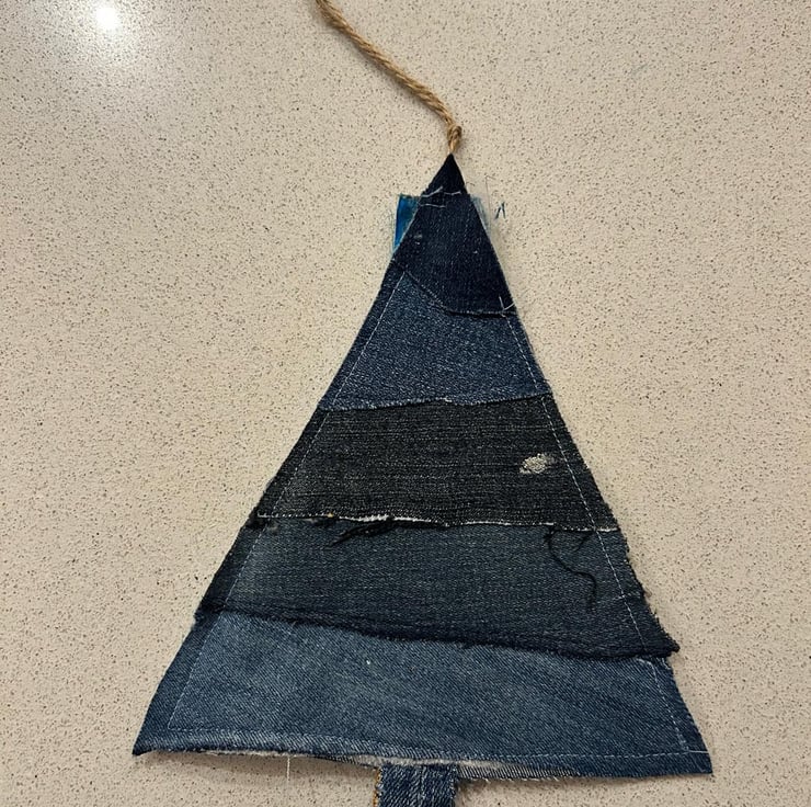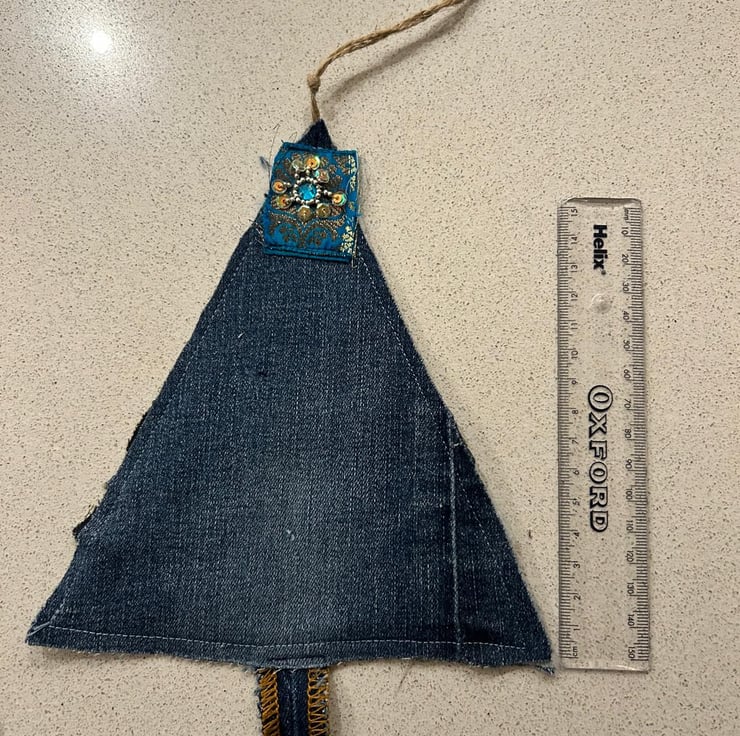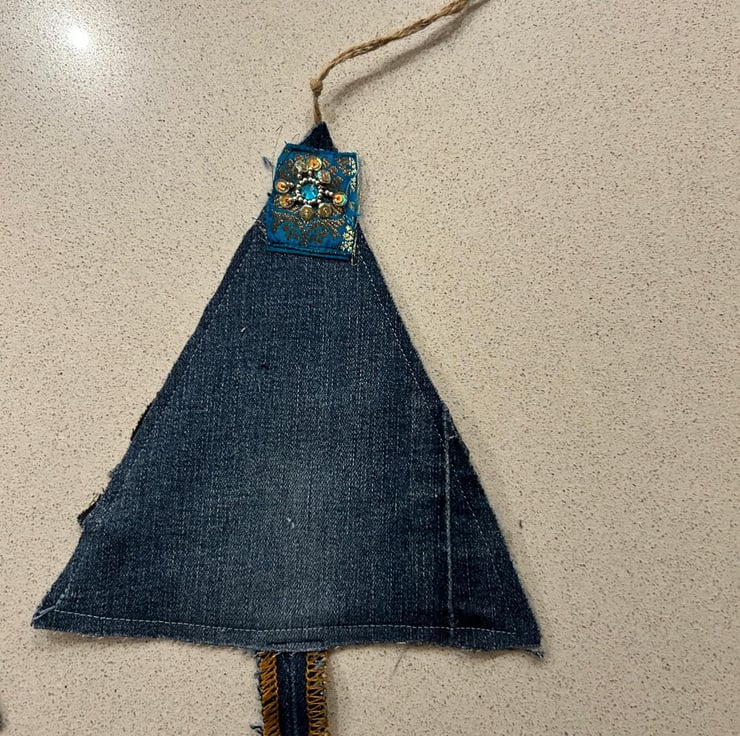 Rather than following a set pattern, each tree is inspired by the particular piece of denim I’m working with at the time. The weight, colour, seams and wear of the fabric help steer the shape and details, so the material itself leads the design. Because of this, no two trees are ever the same — each one has a very individual charm.