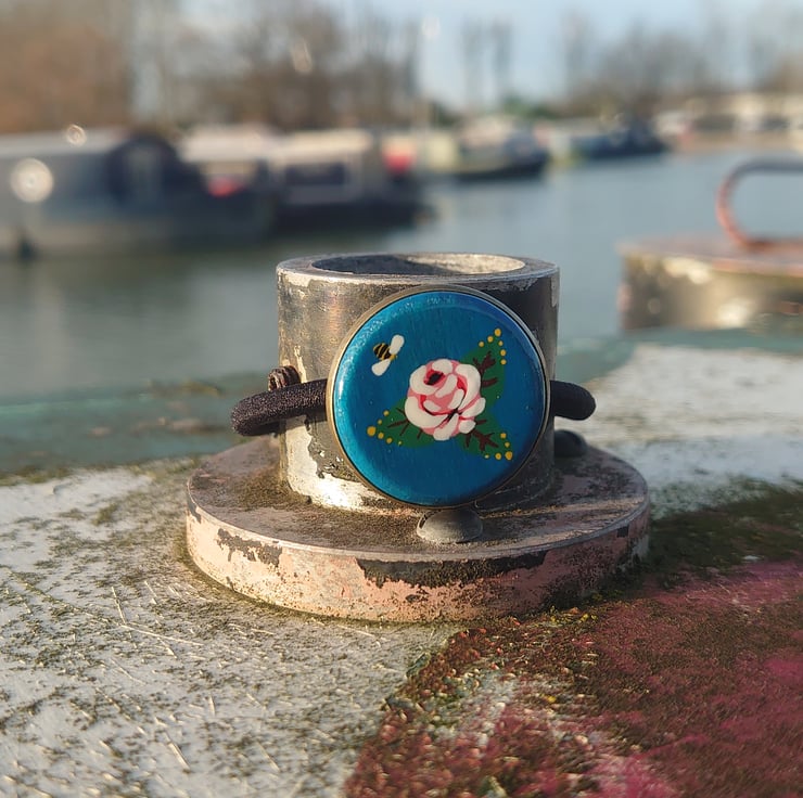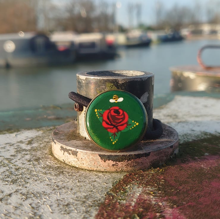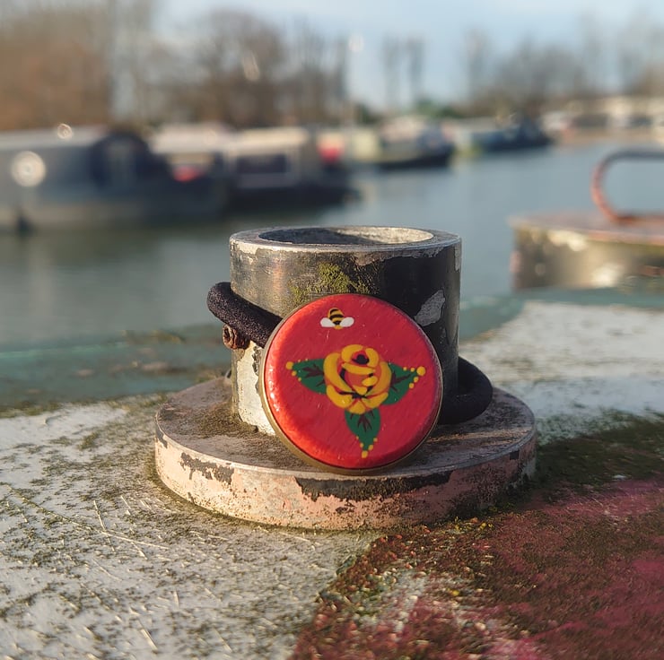 The decorative wooden coin is hand painted with a Knobstick rose and varnished to a high shine.