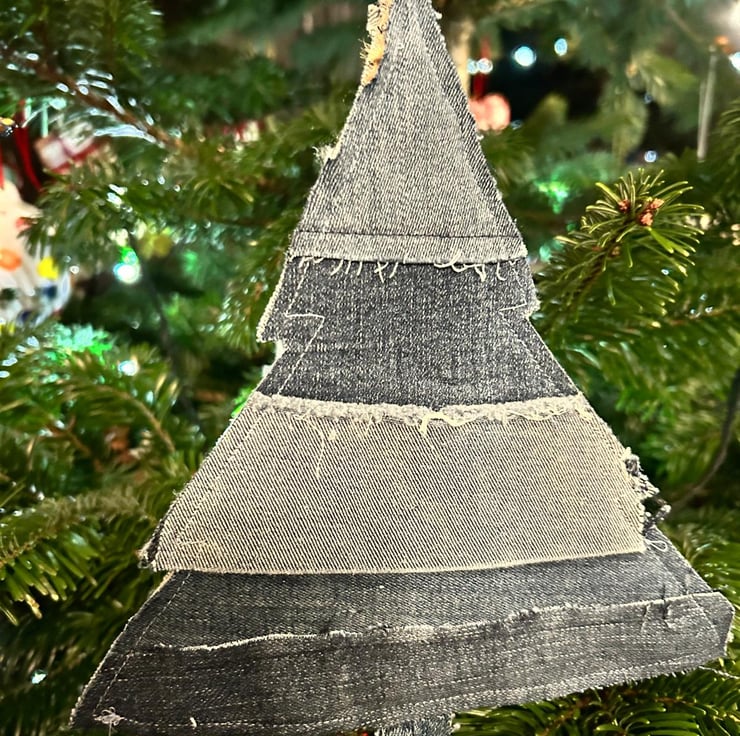 This Christmas tree is completely handmade using upcycled denim and fabric scraps, stitched and shaped slowly to create a truly one-of-a-kind decoration. Each tree has its own character — wonky in places, full of texture, and intentionally rustic.