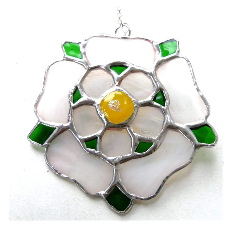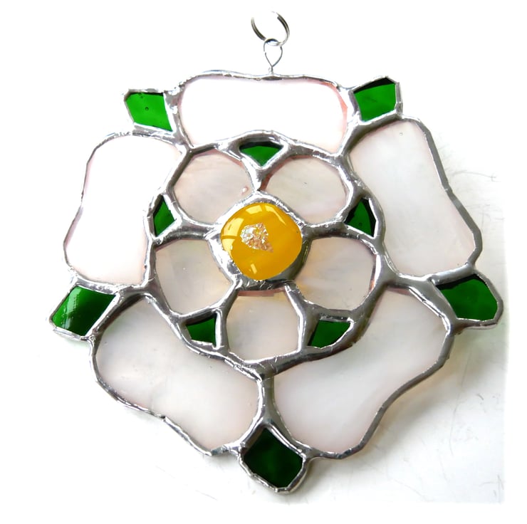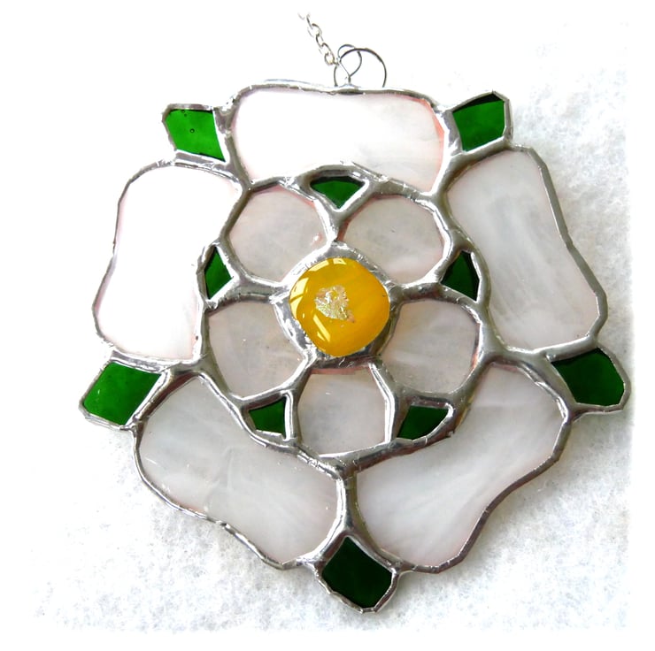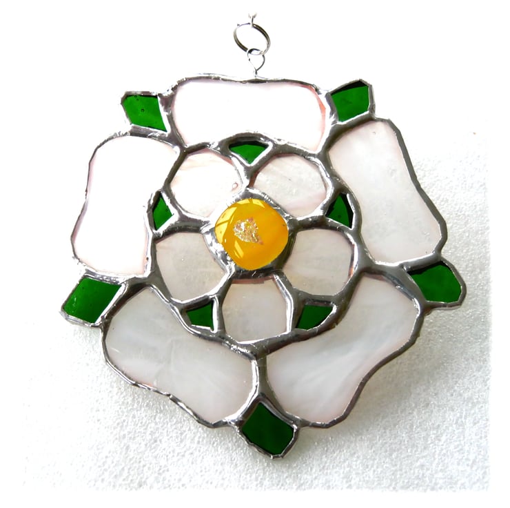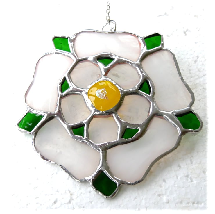 The rose is the classic Yorkshire / Lancashire design with two rings of 5 white glass petals and 2 rings of little green leaves