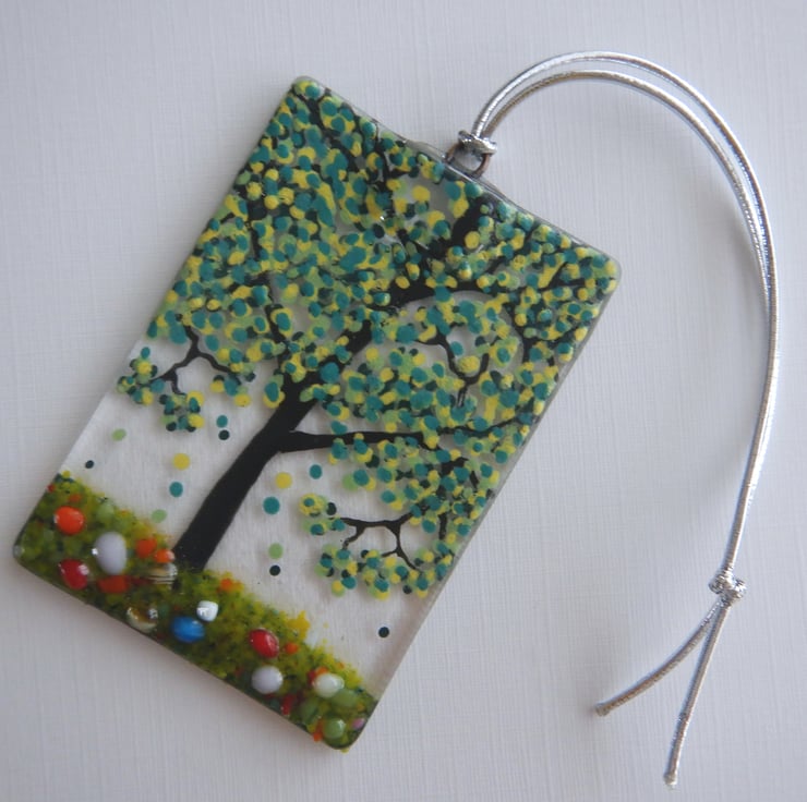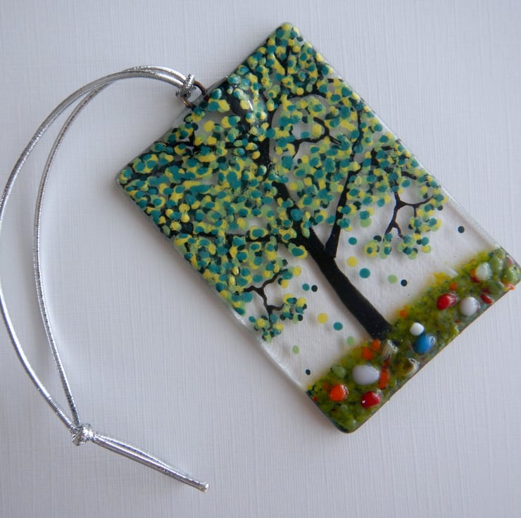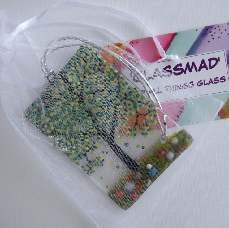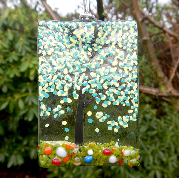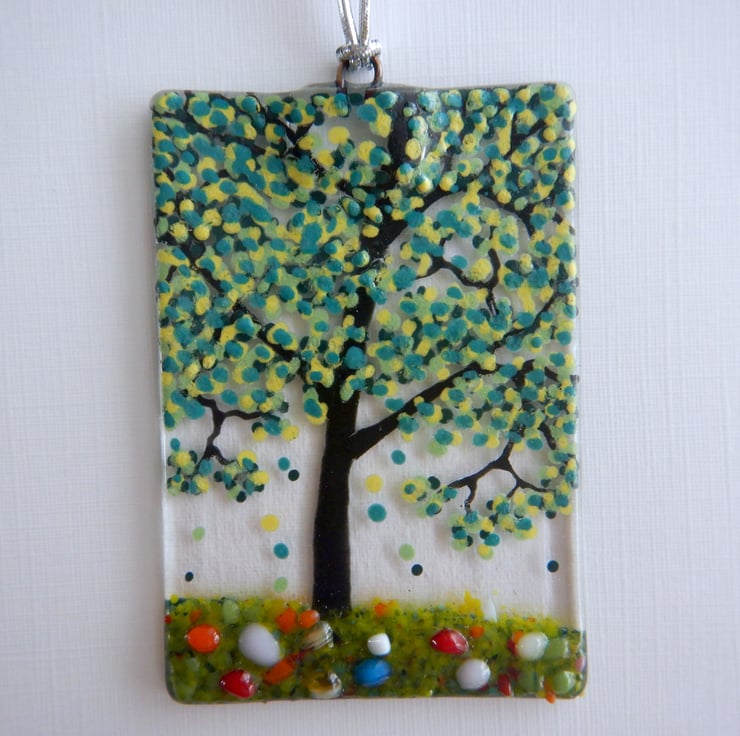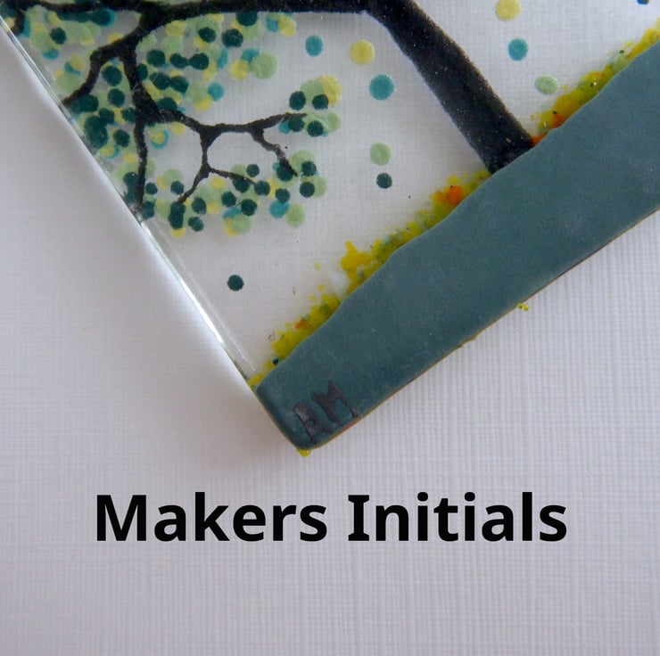 It started off being a simple sheet of transparent fusing glass. The Tree and details were then added using a combination of, frit glass, dichroic glass, and glassline powder.