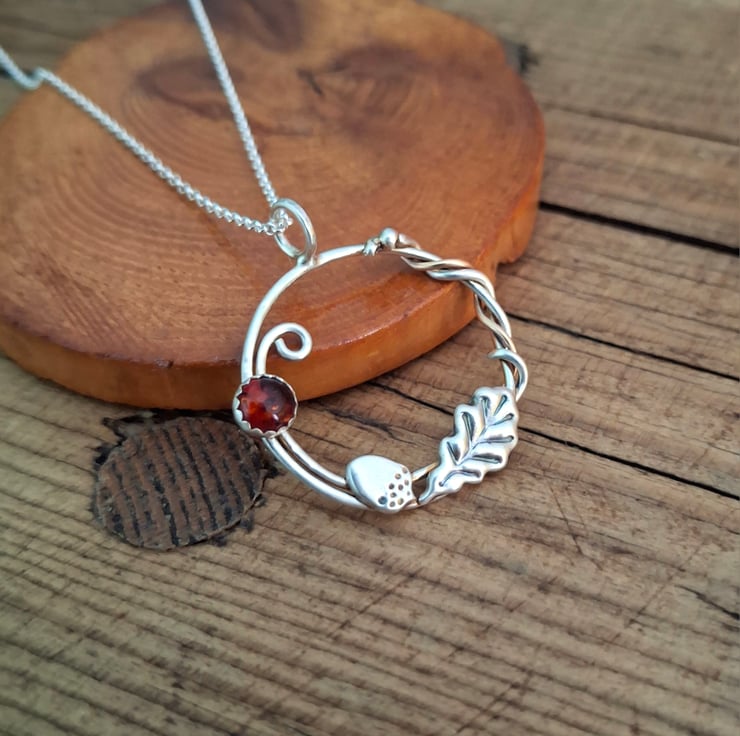 This oak leaf and acorn wreath pendant has a beautiful flowing dynamic with the wreaths symbolic meaning of continuity (circle of life) and the oak & acorn expressing the strength and stability we need to keep going. Amber adds a touch of warmth & light to keep it all in balance.