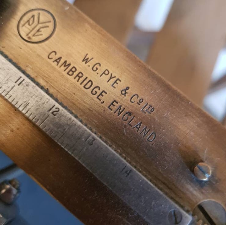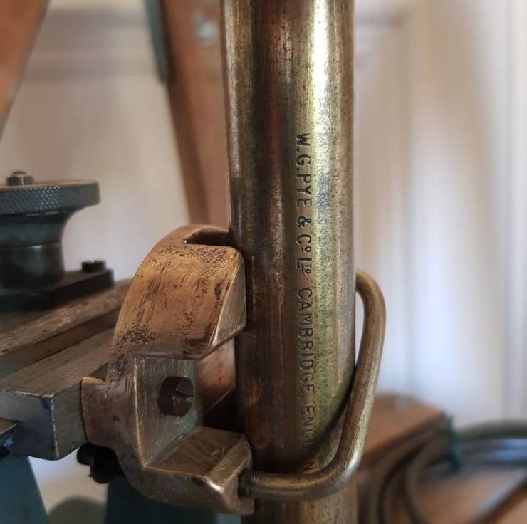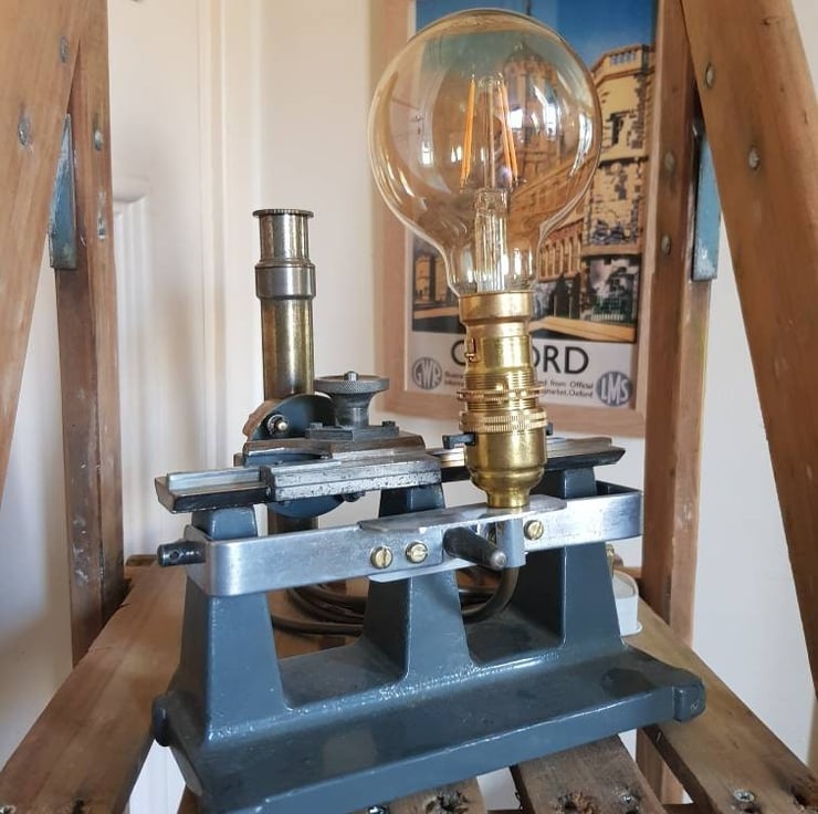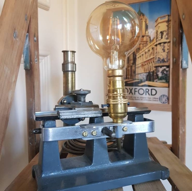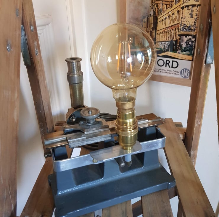 Antique Travelling Microscope manufactured by W G Pye & Co Ltd of Cambridge has been carefully adapted by my Design Tech teacher husband to retain the "integrity of the piece" and provide an alternative desk lamp with a steampunk feel. All new fittings and wire - PAT tested and with a Compton Edison style LED filament bulb provided.