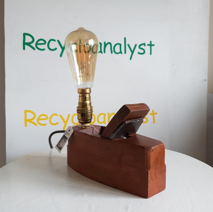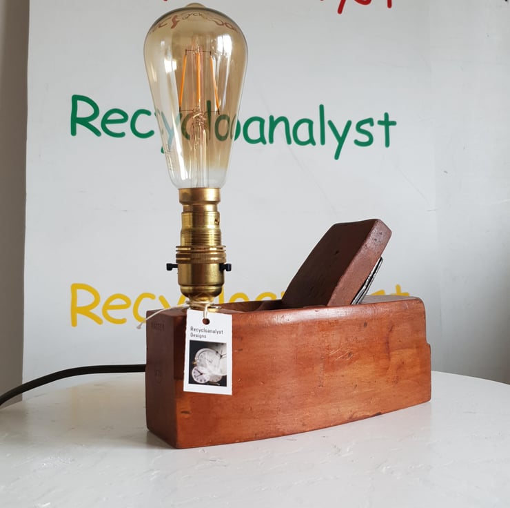 The perfect quirky upcycled vintage gift for any Design Technology teacher or carpenter friend: a well cared for antique, small, traditional carpenters wooden block plane has been given an alternative life as this rustic industrial table lamp. The lamp measures 10 inches high to top of bulb x 3 inches wide x 8 inches long approximately. Neat. compact and a talking point.....