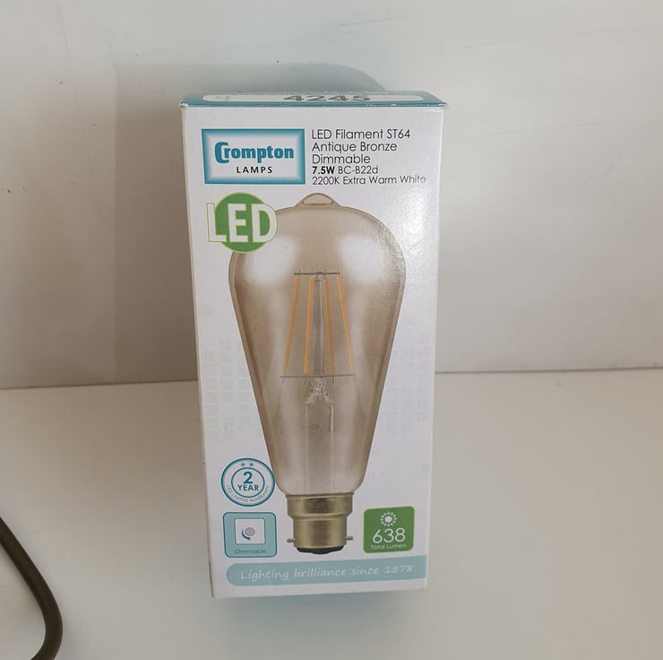 New wiring and fittings and a quality boxed Compton LED Edison-style filament bulb is included with your purchase. The lamp has been safety checked and PAT tested. Free UK delivery.