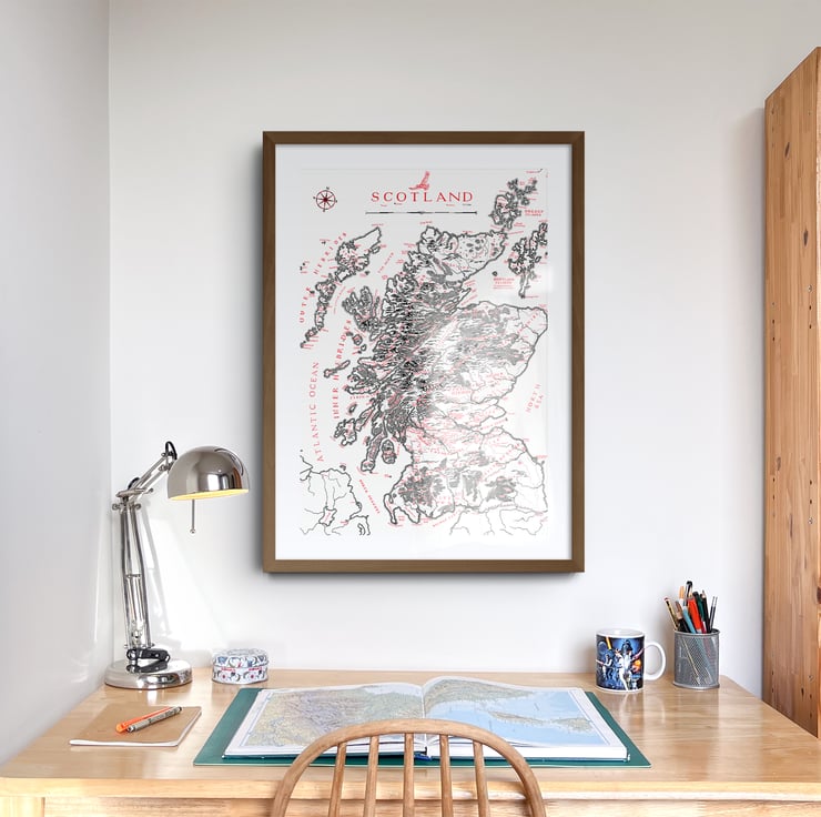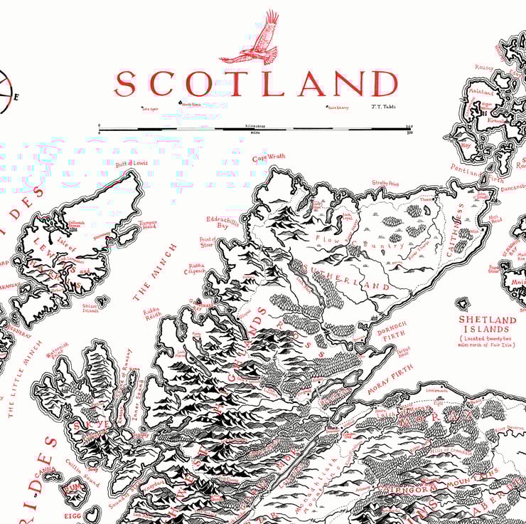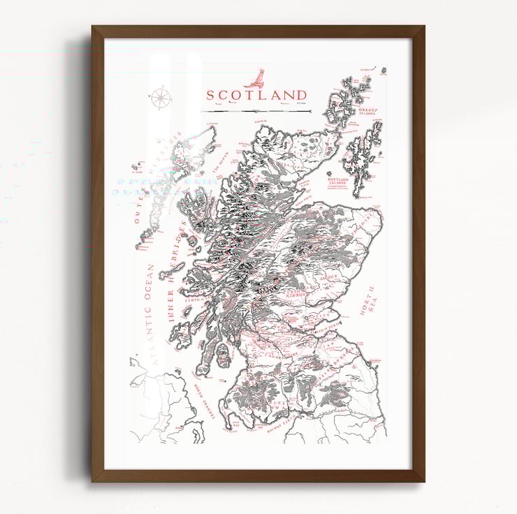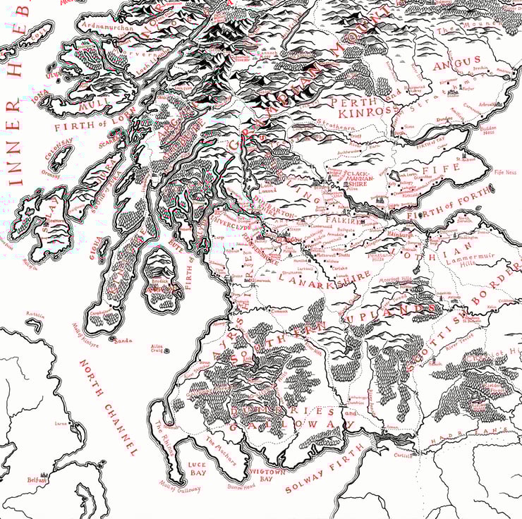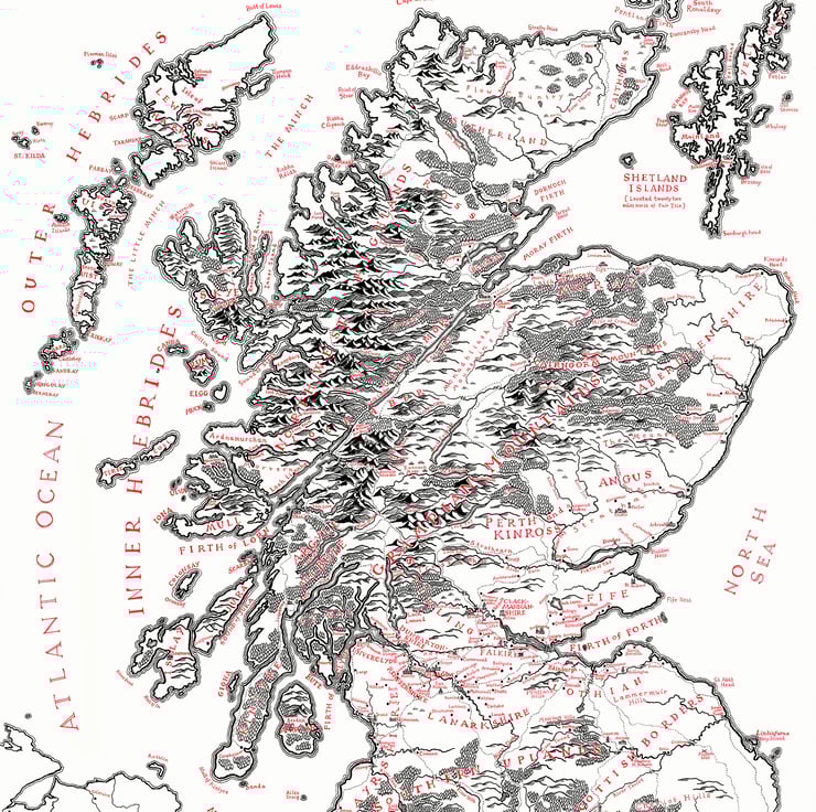 Map of Scotland featuring prominent physical geography and major towns spanning through the Highlands, Lowlands and Islands, inspired by Tolkien's fold-out maps of Middle Earth featured in the books The Lord of the Rings and The Hobbit.
