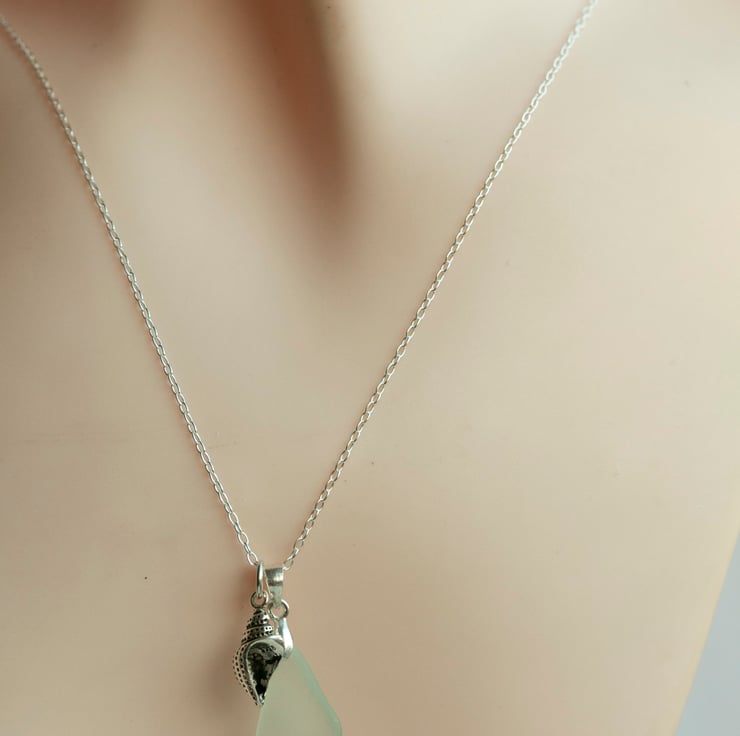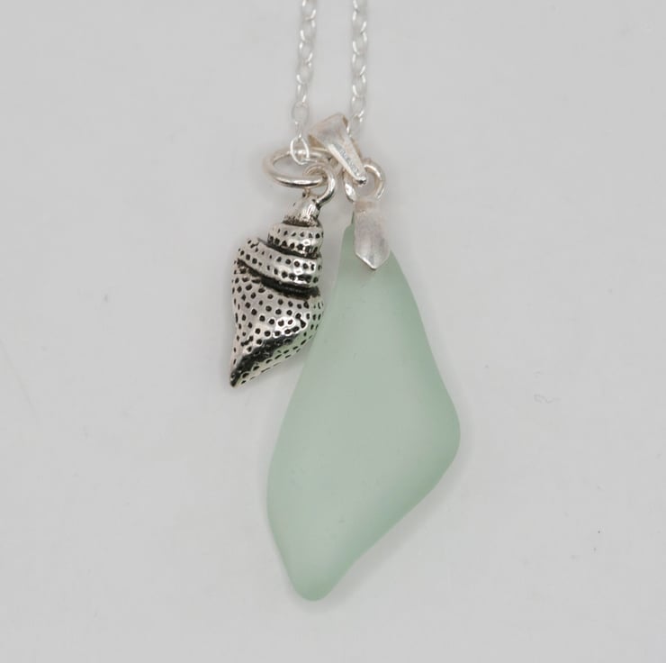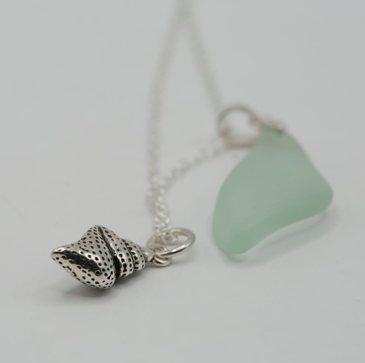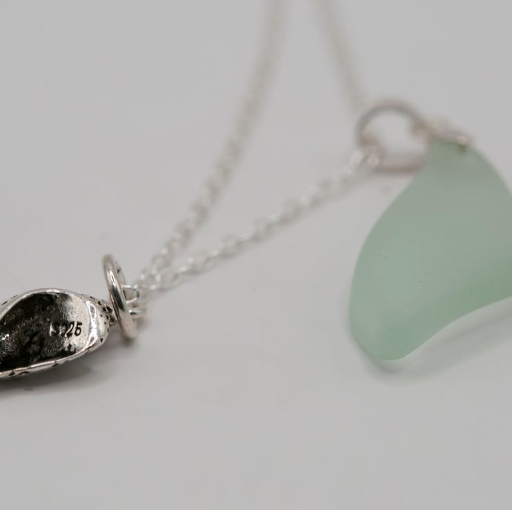 Hand made aqua sea glass necklace with 925 silver clam shell charm on a 16 inch sterling silver chain and bail. The sea glass piece measures 1.5 cm in length and the shell charm 1.2 cm in length. The sea glass has a naturally tumbled shape and was found on the UK southern coastline. The necklace comes in a black gift box with velvet lining and a silver cleaning cloth. 100% recycled silver.