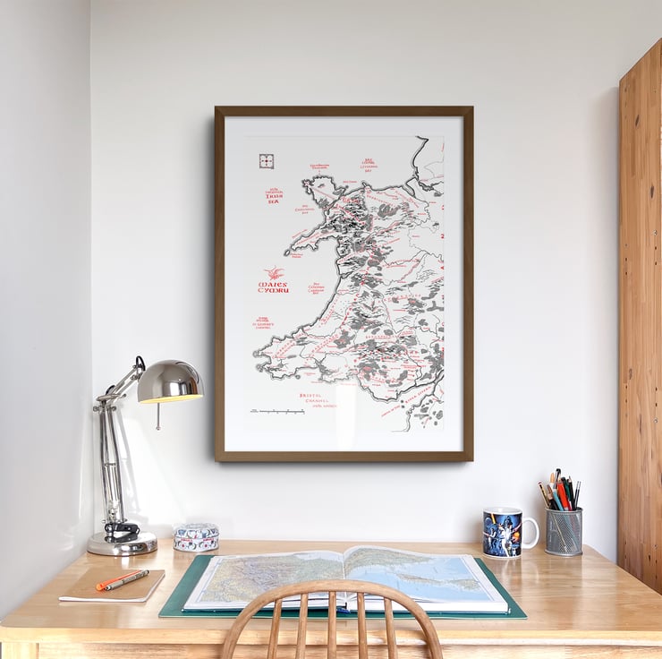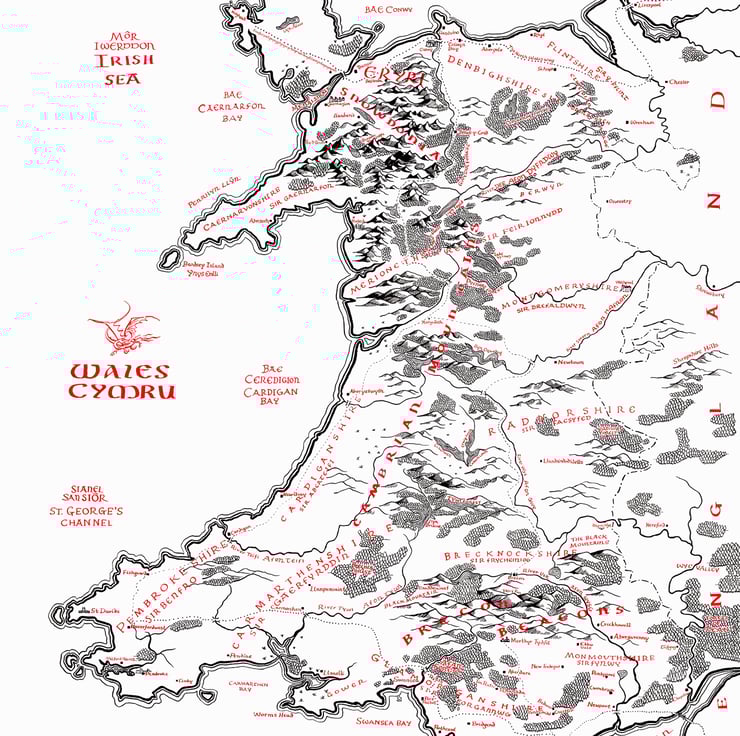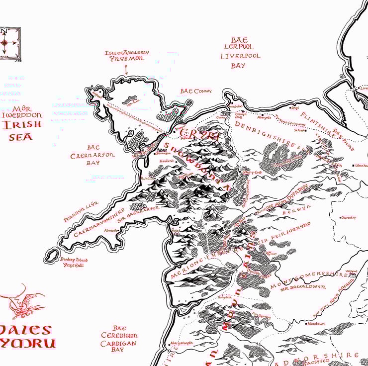 An English language map of Wales inspired by Tolkien's fold-out maps of Middle Earth featured in the books The Lord of the Rings and The Hobbit.
