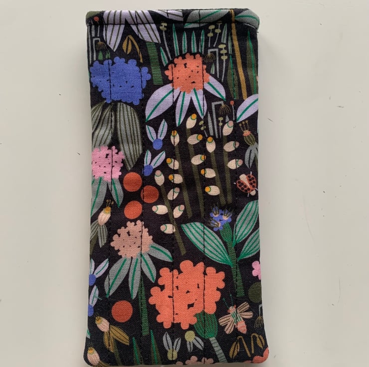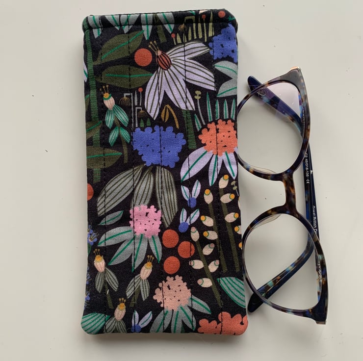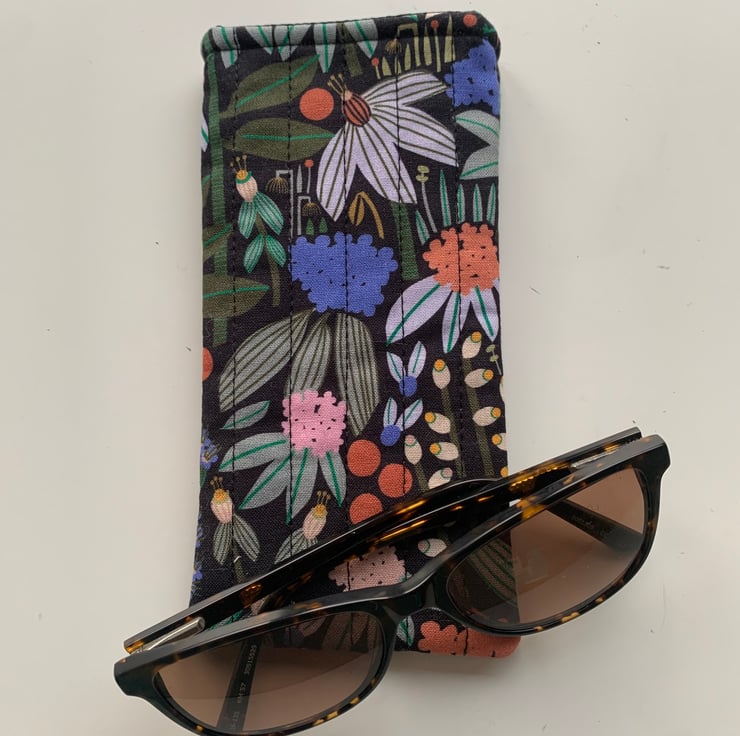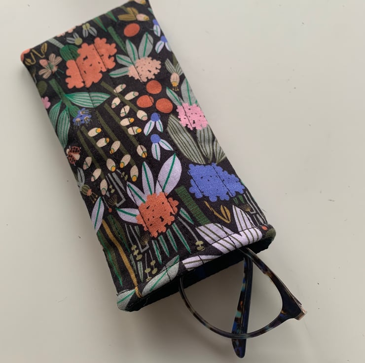 The padded slip in style glasses/sunglasses case is made in this lovely garden flowers and creatures print fabric on a black background.