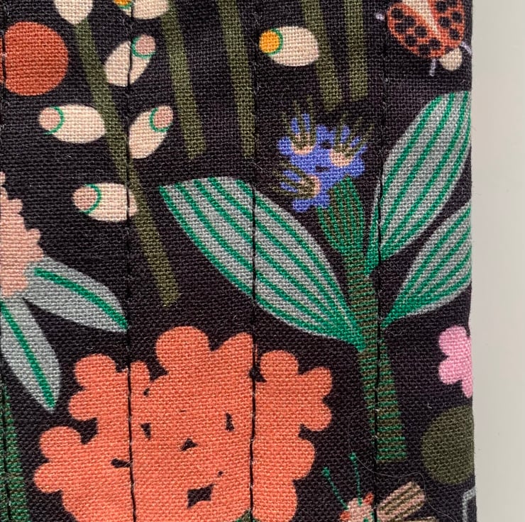 The case is quilted with black thread and is fully lined in plain black cotton.