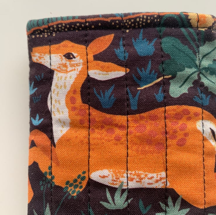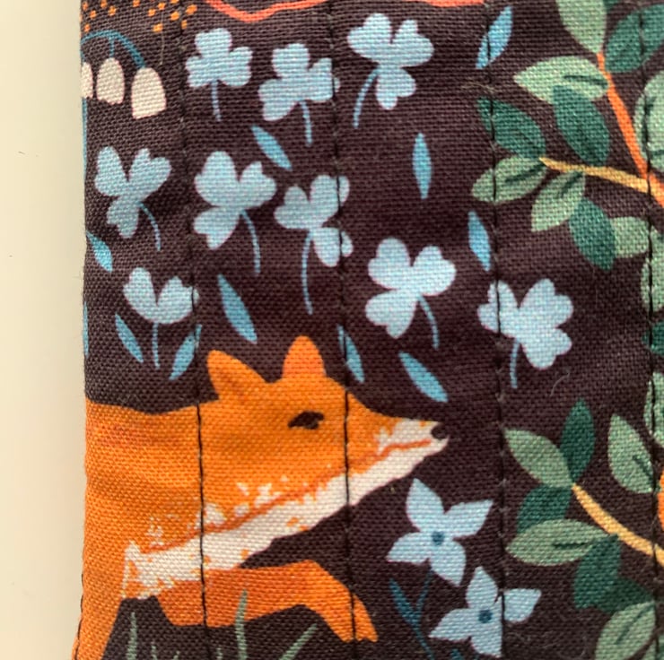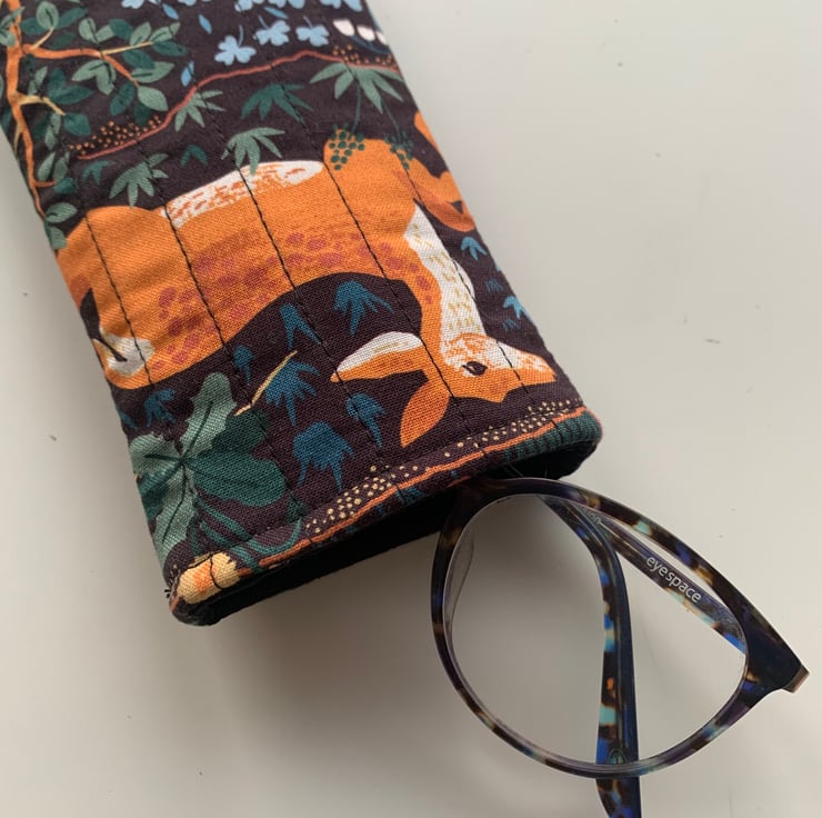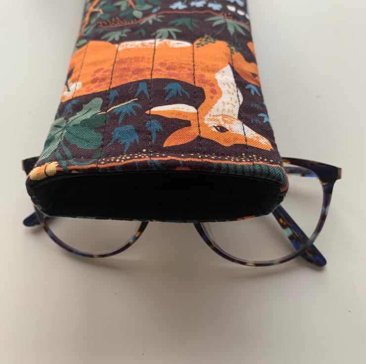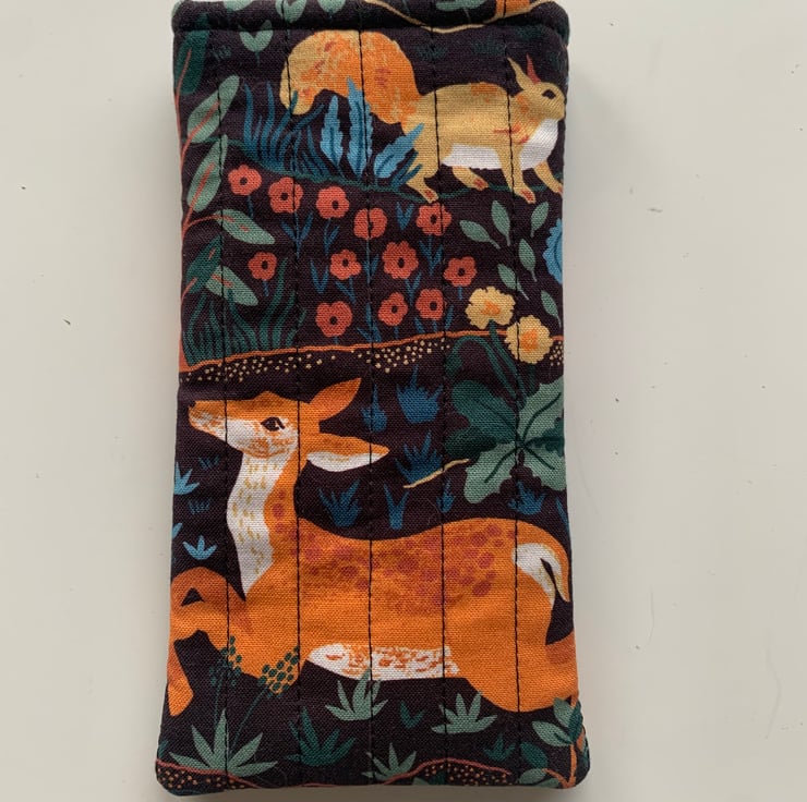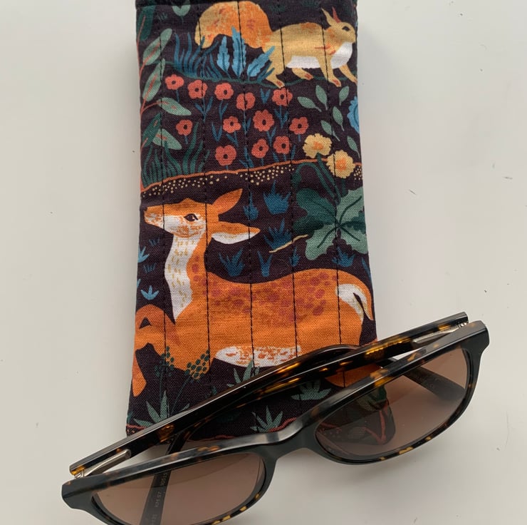 The padded slip in style glasses/sunglasses case is made in this lovely woodland animals fabric featuring a deer, red squirrel and a fox.