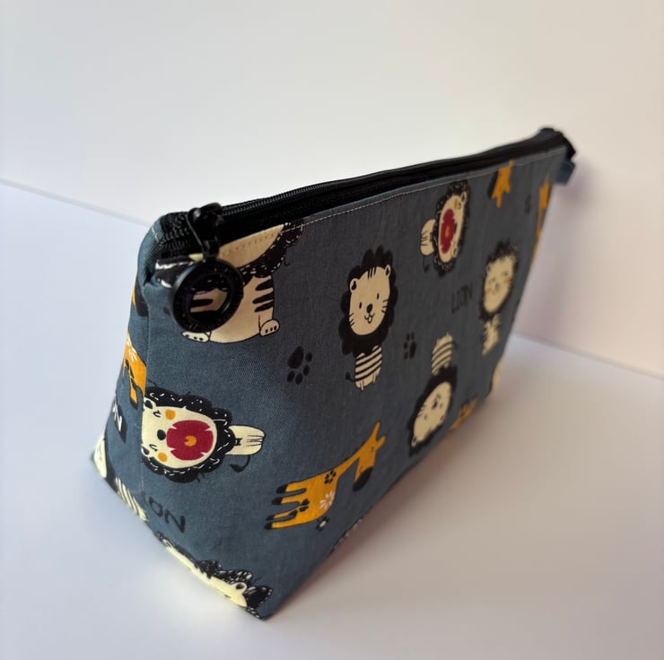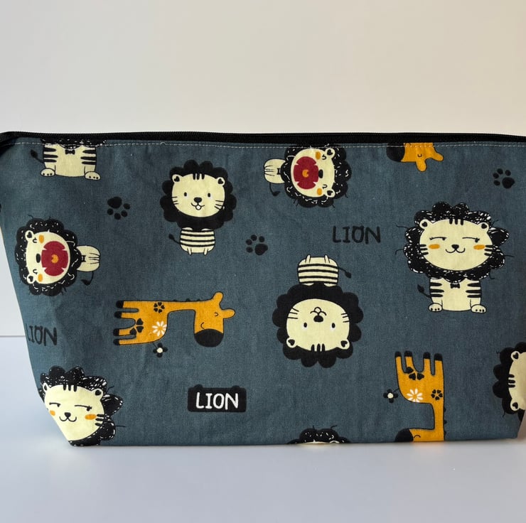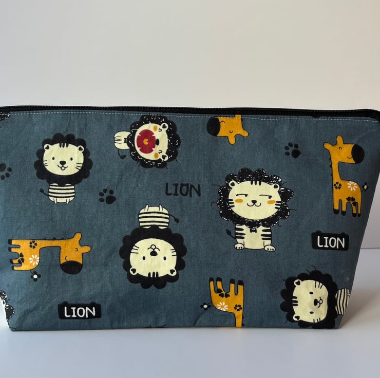 The trendy grey cotton exterior features adorable lions. The lining is a waterproof, white PVC and the zip is black with a stylish, black ring zip pull.