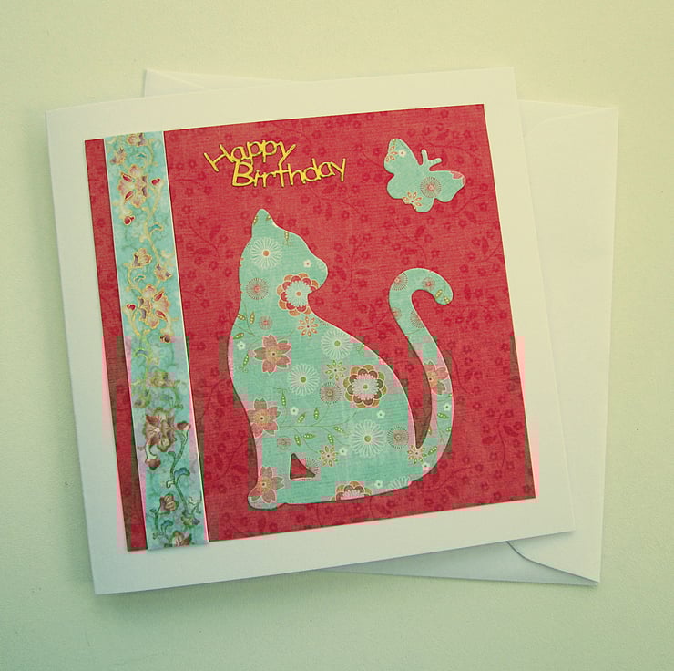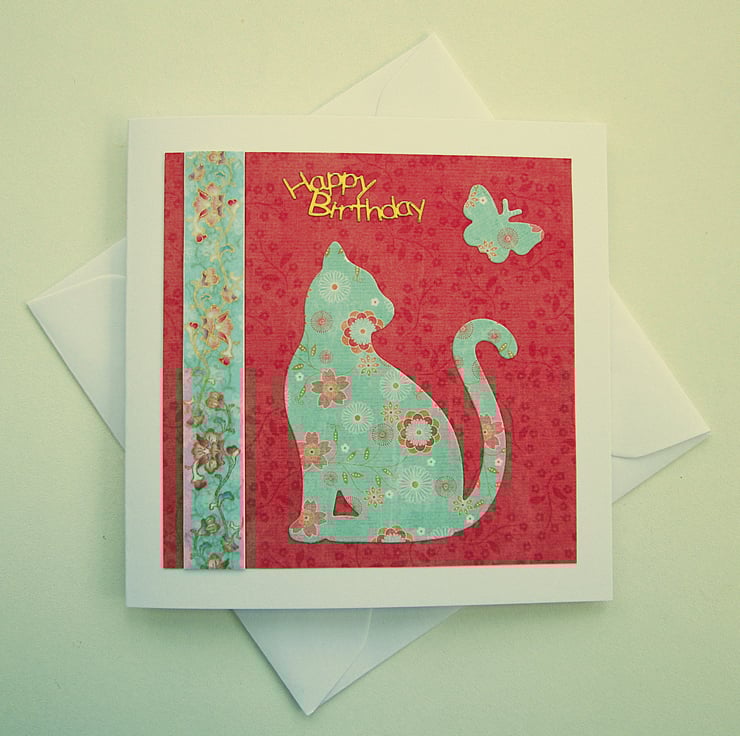 A lovely floral cat and butterfly birthday card. Made with cardstock and washi tape mounted onto a square card which is blank inside for your special message.