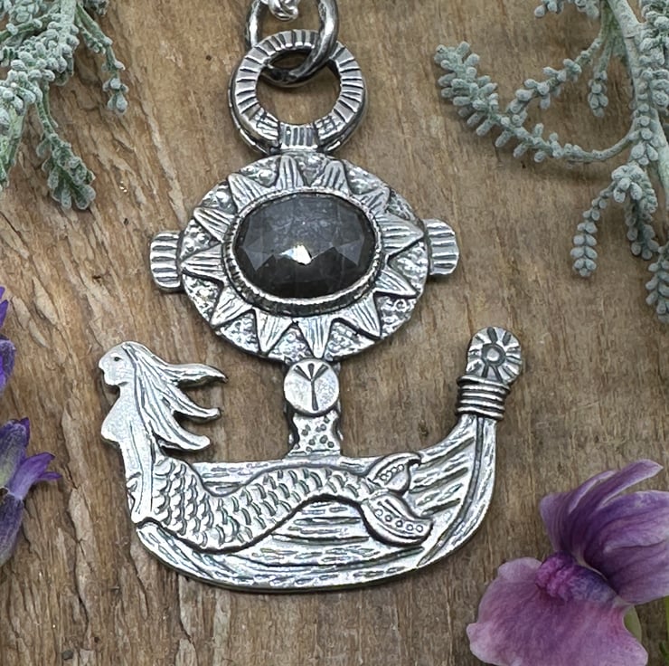 Inspired by my love of all things Mermaid and Viking! A Viking Ship pendant with a grey sapphire cabochon set in the sail.