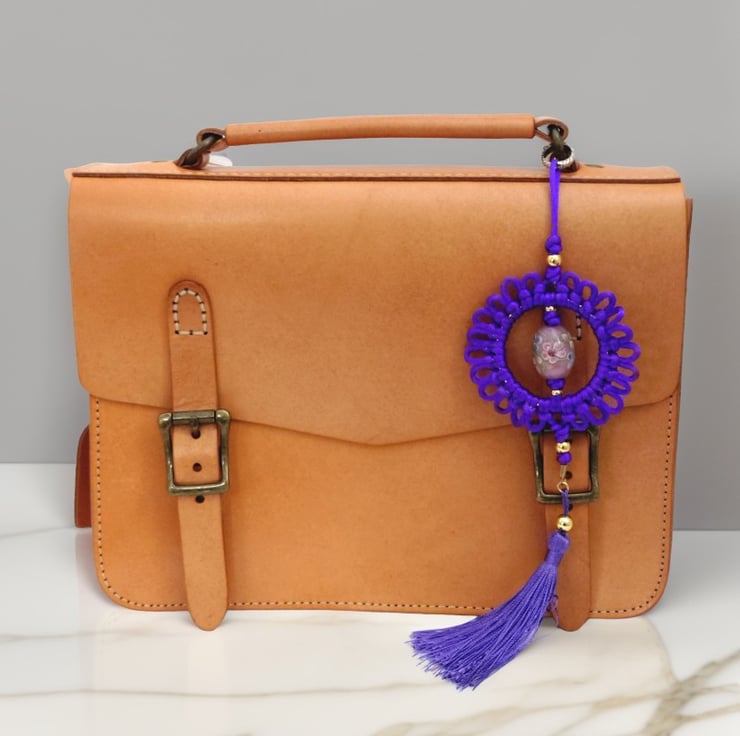 This handcrafted macramé bag charm is made using rich purple cord, carefully knotted into a delicate circular pattern. At the centre sits a decorative floral glass bead, complemented by small metal beads and finished with a matching purple tassel for gentle movement and texture.