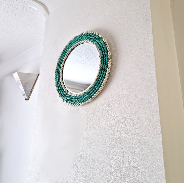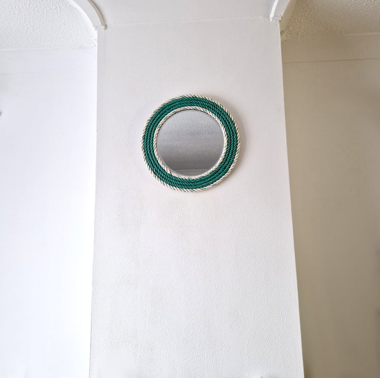 Porthole mirror made from recycled fishing ropes which have been cleaned, dried and repurposed. Created since 2019 using lost or discarded fishing gear washed ashore on our Dorset beaches.