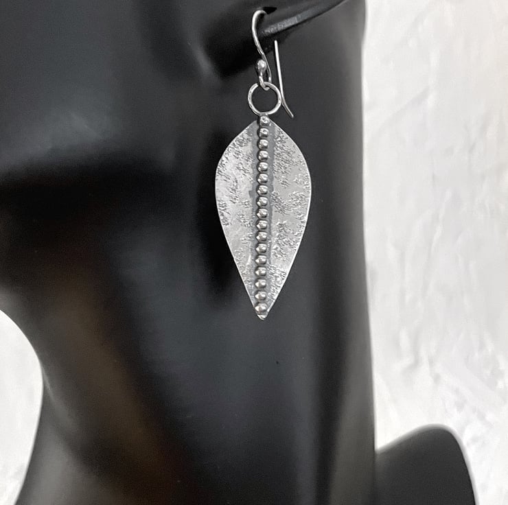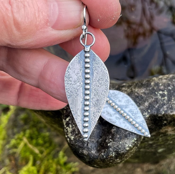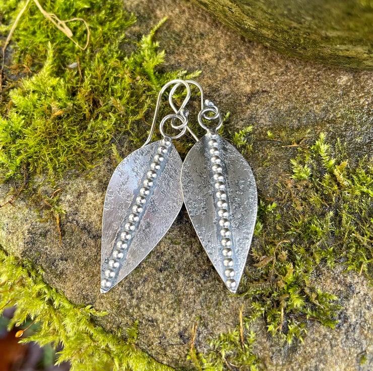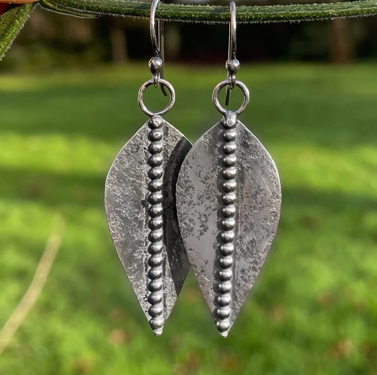 The silver shield shapes have been textured with hammers, I have soldered a central ridge of raised beaded wire.
