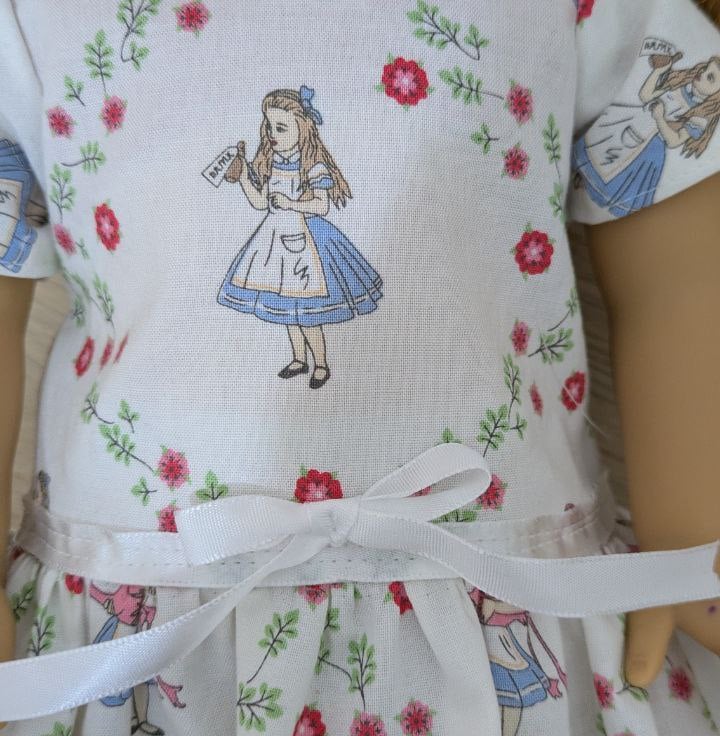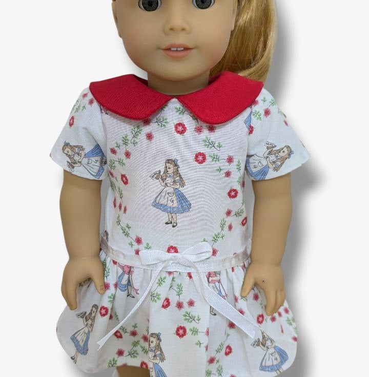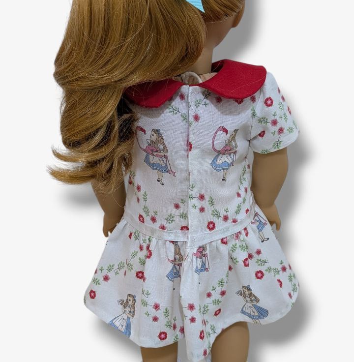 A beautifully handmade Alice in Wonderland inspired dress, created with care and attention to detail. This charming outfit is designed to fit American Girl, Our Generation, and other similar 18" dolls.