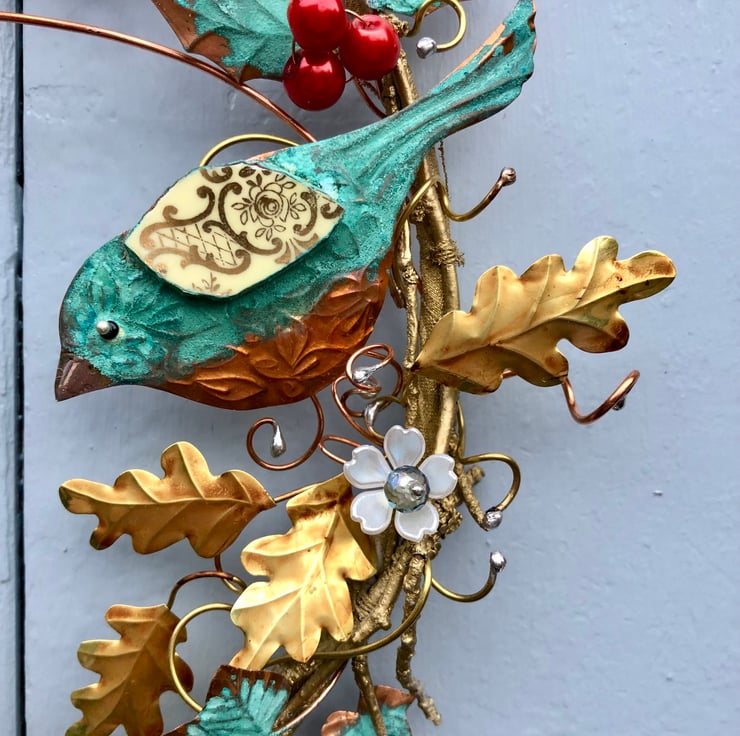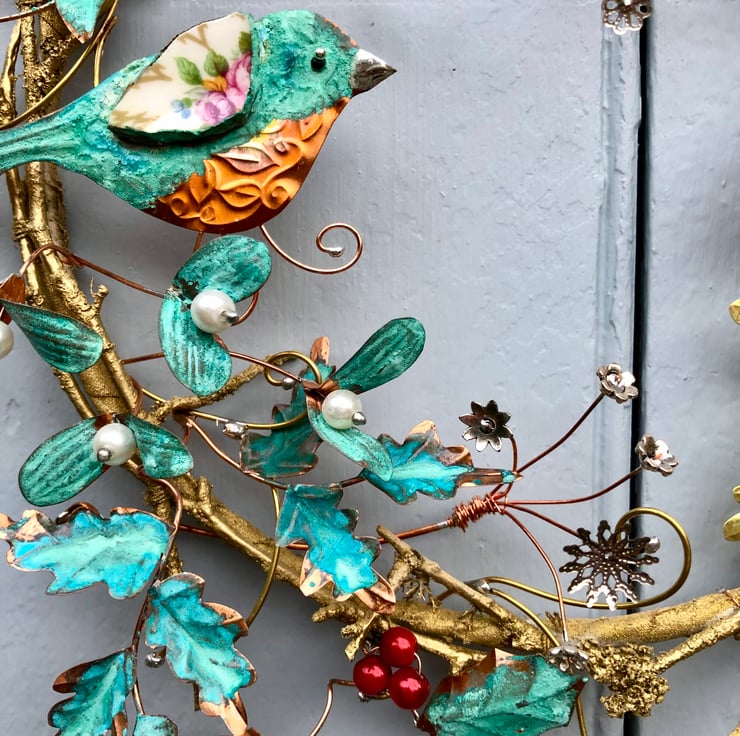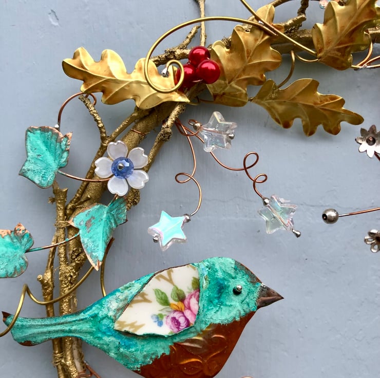 A festive robin wreath mounted on a steel ring 175mm diameter, bound in calico strips with Birch twigs sewn on, then painted gold. It is decorated with embossed and soldered verdigris copper and brass leaves, mother of pearl effect flowers and decorative charms. Perched in the branches are two gorgeous copper robins with wings fashioned from old china fragments.