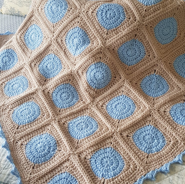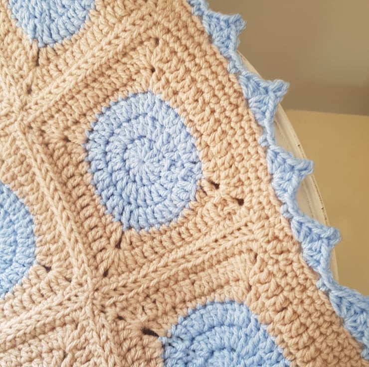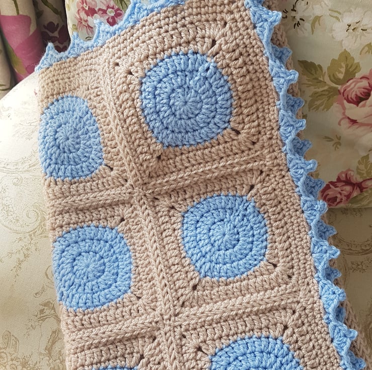 Hand crocheted baby blanket made from soft DK acrylic yarn, making it easy to machine wash and gently reshape. Featuring classic pale blue and beige squares, finished with a delicate picot edging for a timeless look.
