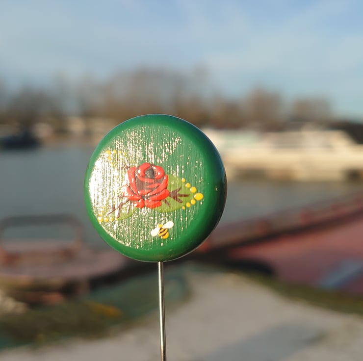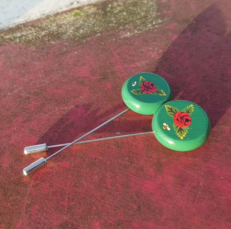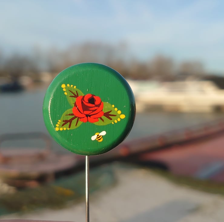 Suitable for both formal and smart casual dress, the pins are 25 mm diameter and decorated with a single rose in the style of the British canals. Known as Roses and Castles it's a traditional British folk art.