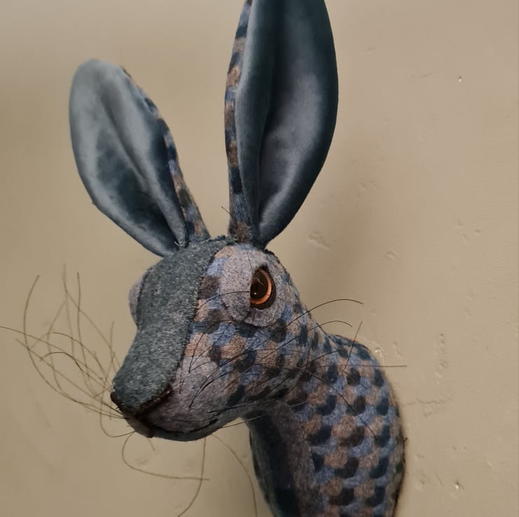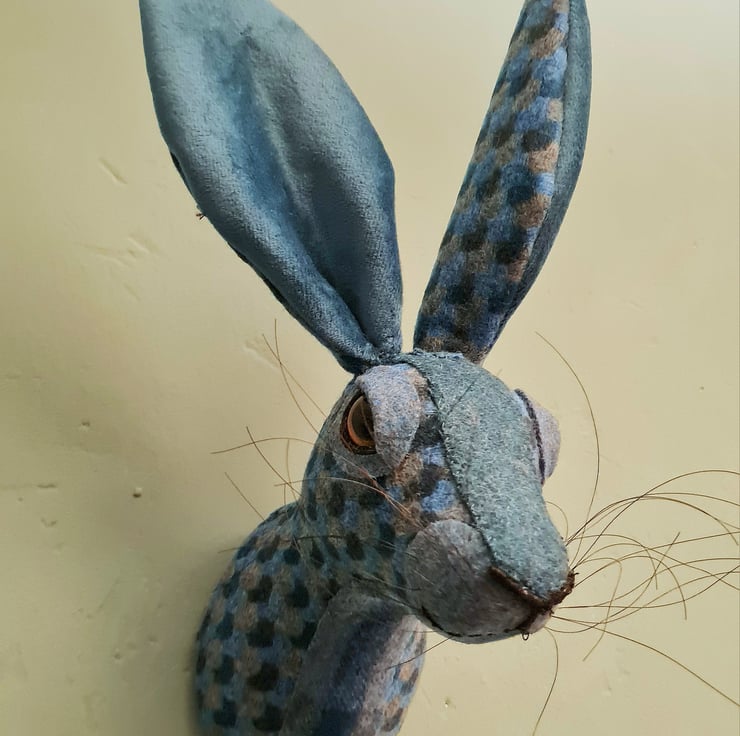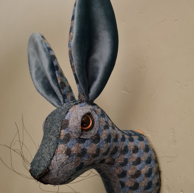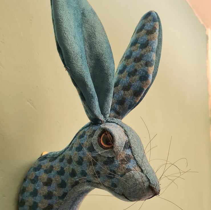 A lifesize faux hare which I have handmade and covered in hand stitched teal and grey coloured Abraham Moon wool. The head is backed with felt and has a metal hanger to hang it on the wall. It is lightweight.
