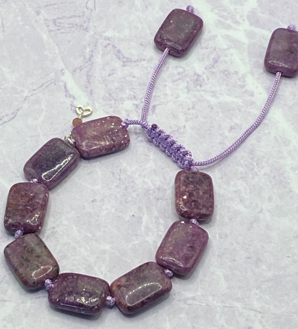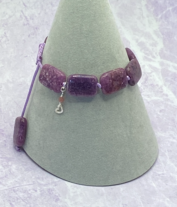 Knotted purple satin cord bracelet featuring purple rectangular stones of lepidolite, with a little silver plated heart and tiny matching lepidolite stone charm dangling on the side for a finishing touch.