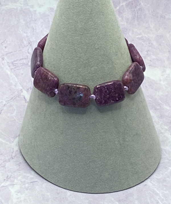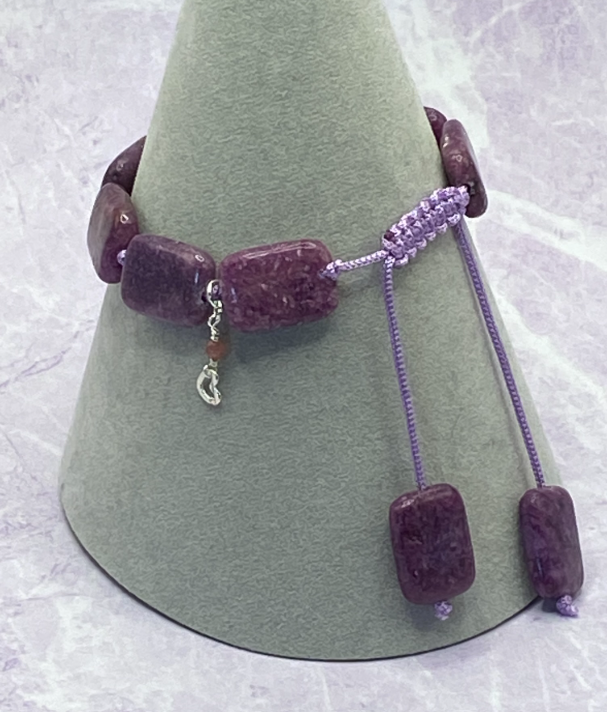 Knotted purple macrame cord bracelet with rectangular lepidolite stones