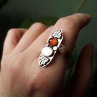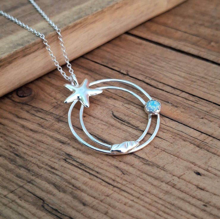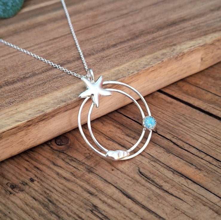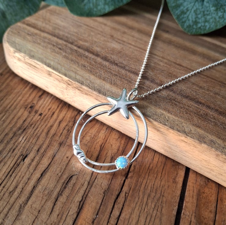 A beautiful swirly, wavy circle pendant with a starfish charm, a deep glittering opal stone and a little shell make this the perfect treasure for an ocean lover.