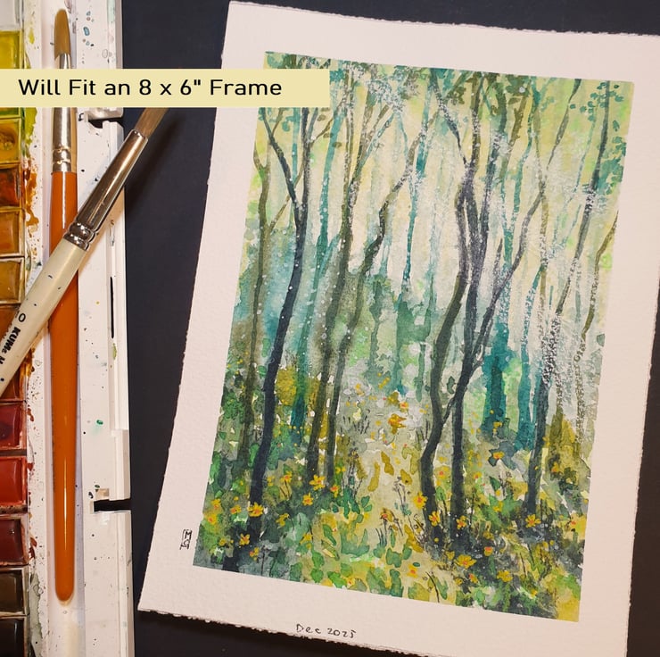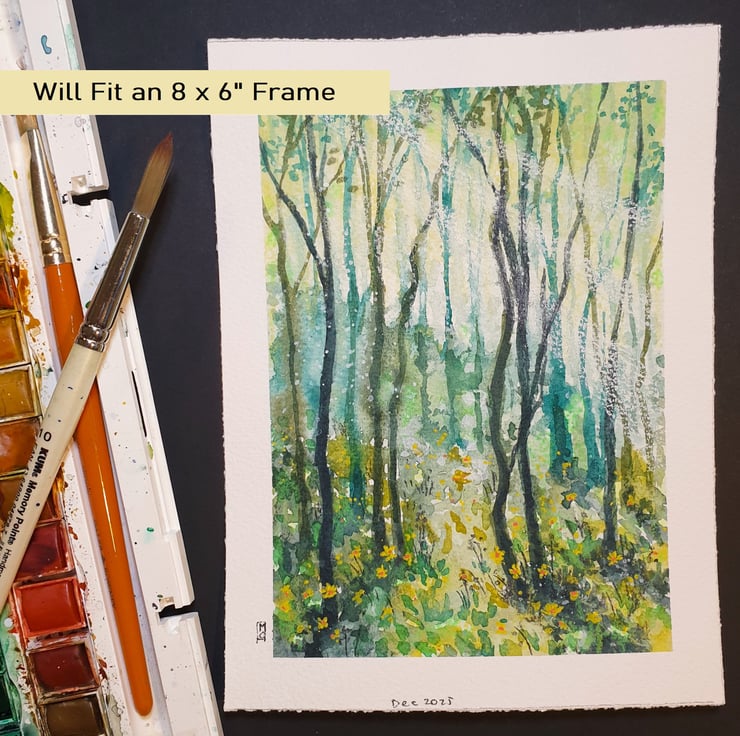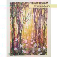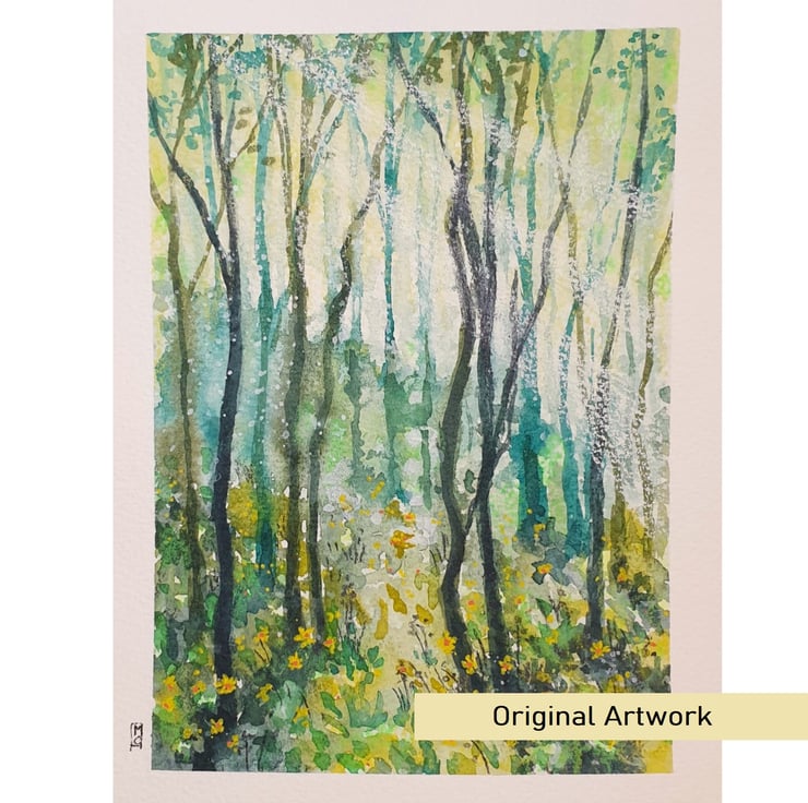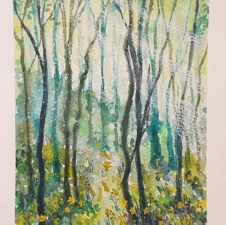 A painting of a forest in a palette of mostly greens with layers of washes and a warm yellow glaze. The painting shows a woodland area with tiny yellow flowers.