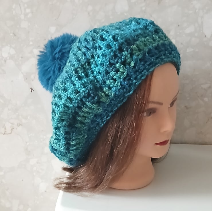It is made with James C. Brett Marble Chunky yarn in shade Azure Seas using a 7 mm (K) crochet hook. To fit adult. Circumference: 60 cm or 24 inches. Length: 22 cm or 9 inches.