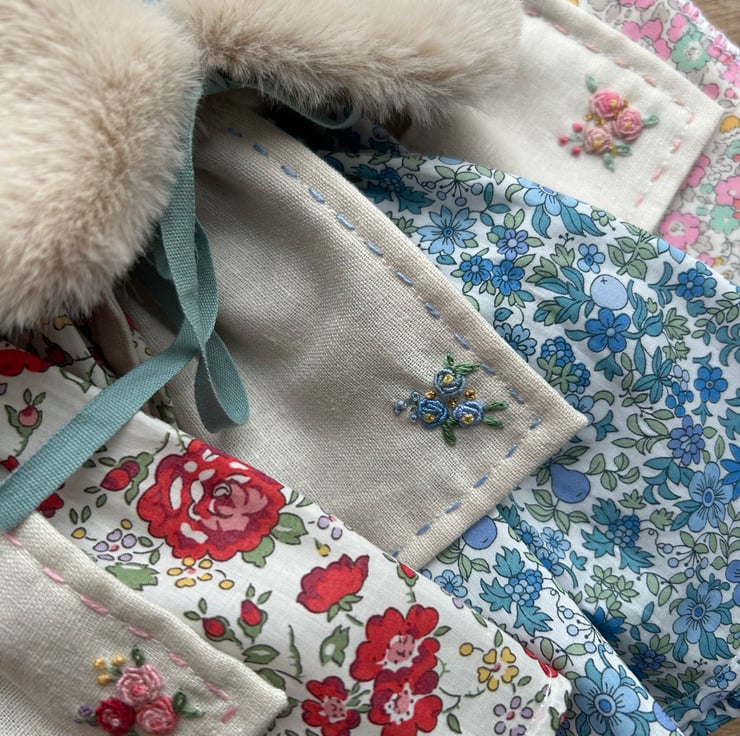 Her apron is made from cotton/linen fabric and embroidered with tiny running stitches and a little sprig of flowers.