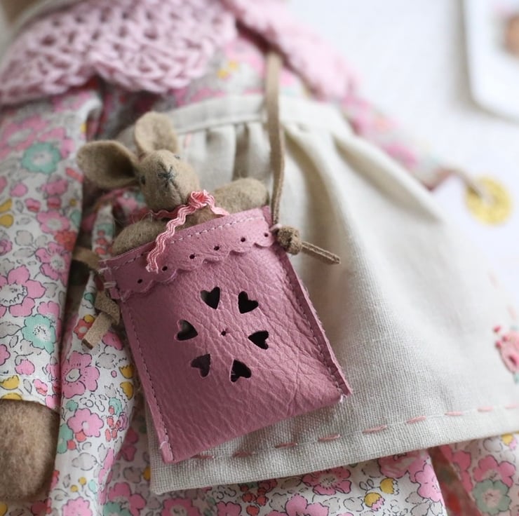 Her accessories include a tiny leather bag, hand punched with a daisy design and containing a baby bunny with a ric rac tie.