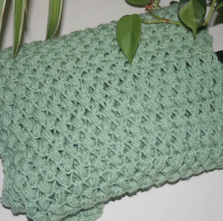 A beautiful handmade, unique, aloe shade of scarf that has a lovely intricate and textured bean stitch which creates a thicker feel to it and it is very cosy and warm. Suitable for all, it is very soft and would be ideal for a chilly day. Made with kind permission of the original pattern designer. It will be carefully wrapped and placed in tissue paper along with with the care instructions.