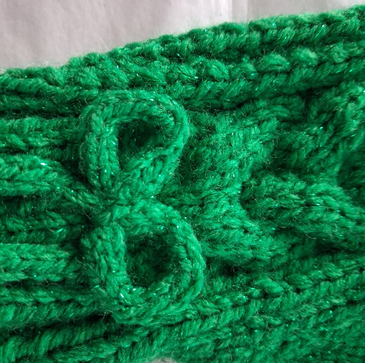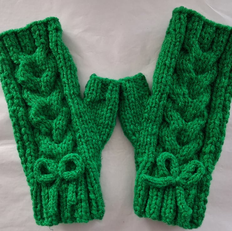 This is a pair of fingerless gloves knitted with a lovely sparkly green yarn. There is a cable pattern on the back complete with a bow at the wrist. These are nice and thick and would fit a small to medium hand.