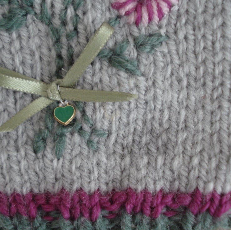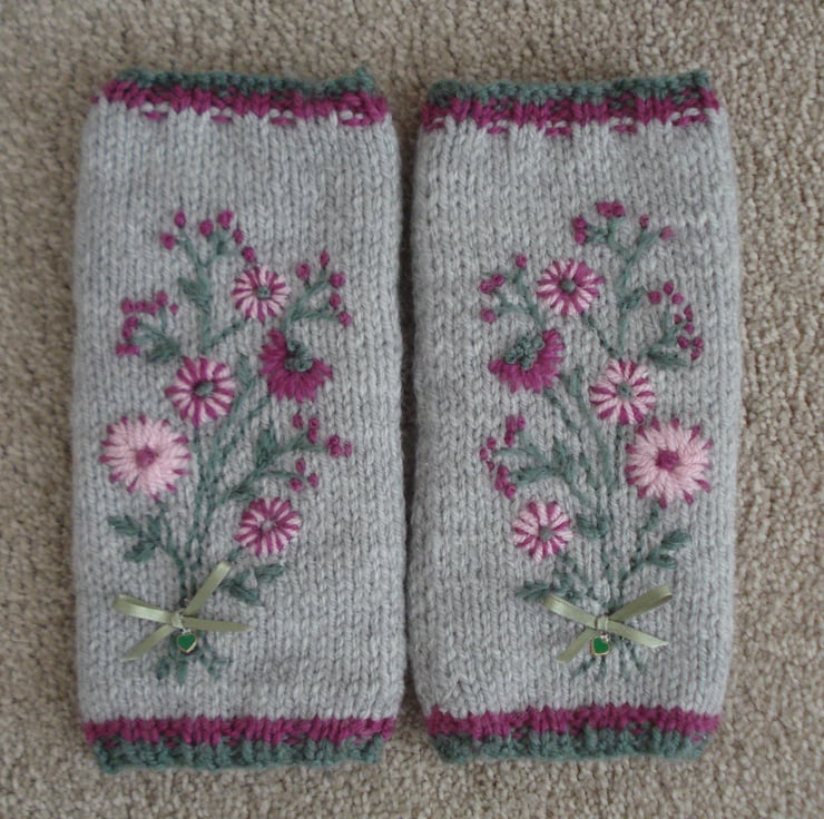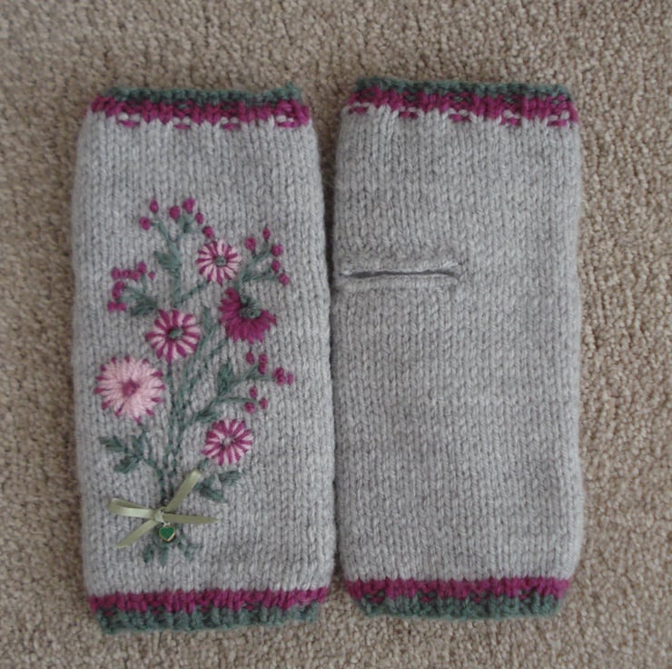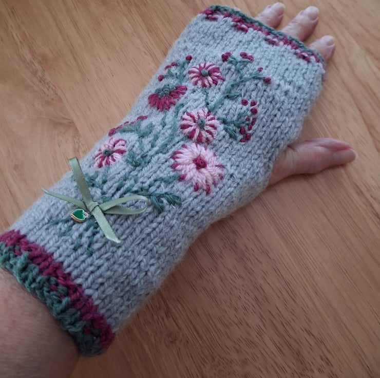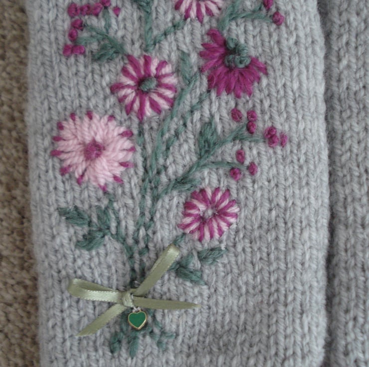 This is a pair of hand knitted and then free hand embroidered fingerless gloves. The glove is a pale grey with dark red and green edging. The flowers are various shades of pink and are embroidered free hand and therefore may vary slightly, all tied with a pale green ribbon and green heart at the wrist. The gloves are lined with white fleece making them extra cosy. They would fit a small to medium hand and are 22cm long.