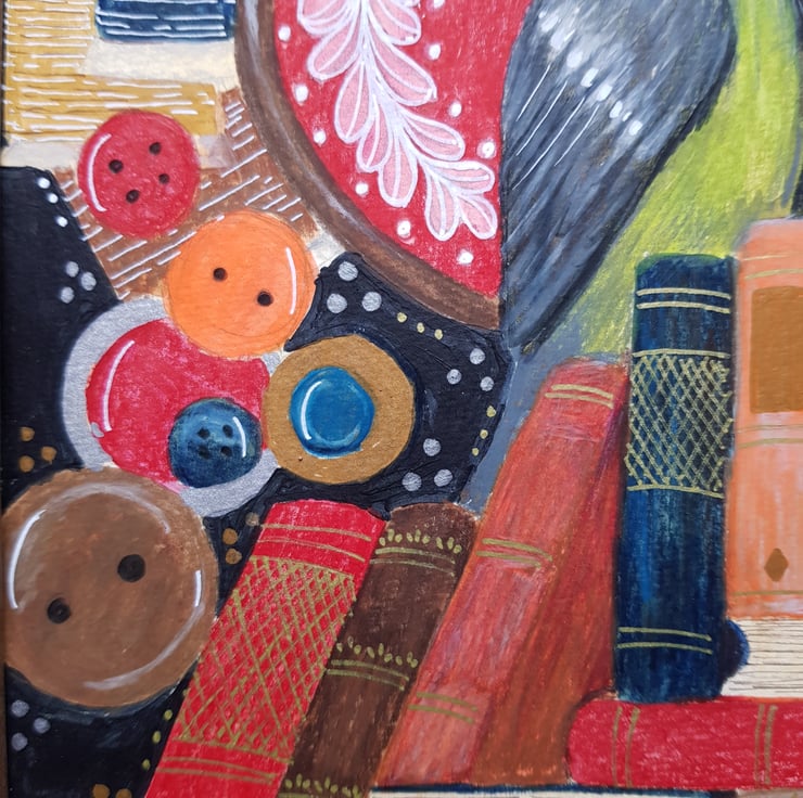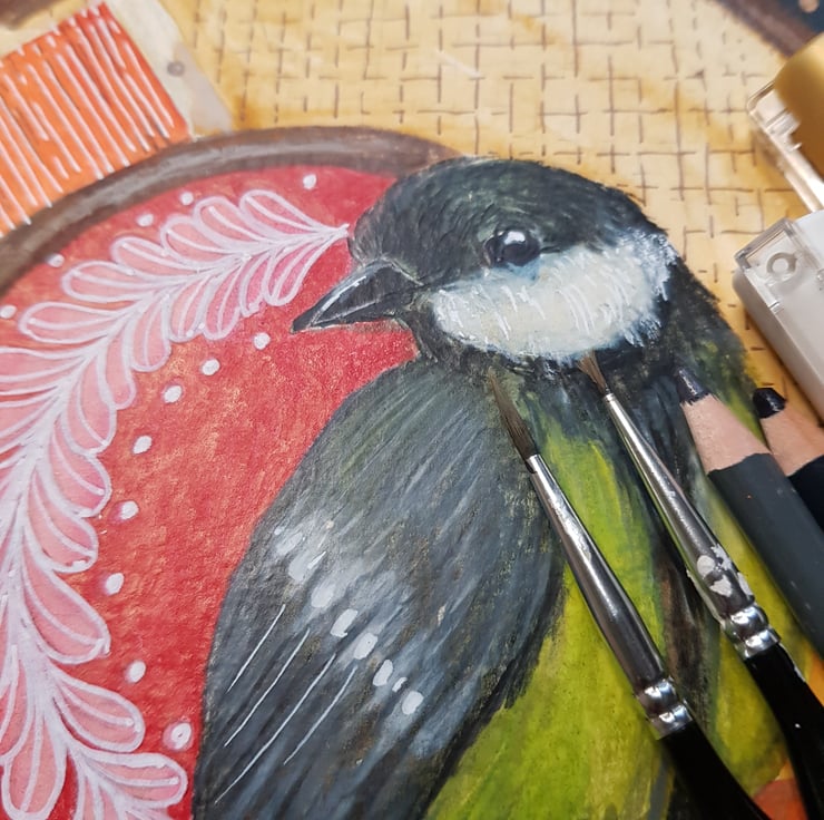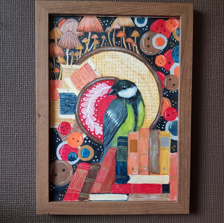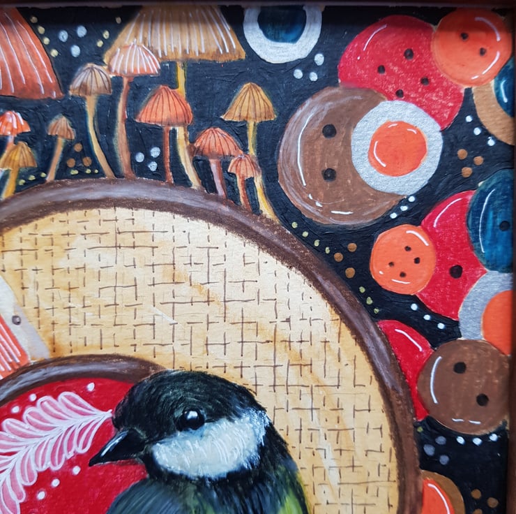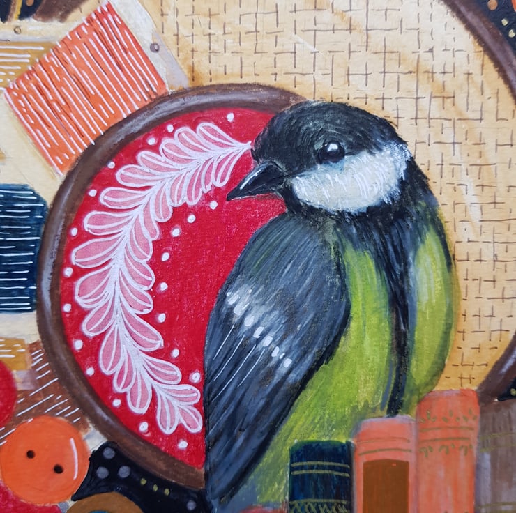 This is another painting inspired by cold weather crafting whilst being distracted by the songbirds visiting our garden. The painting will make a great gift for anyone who enjoys getting creative with colourful threads, likes collecting vintage buttons, loves reading, country walks and watching British garden birds.