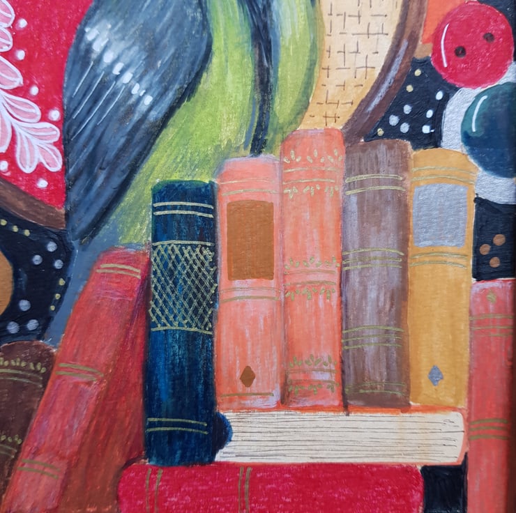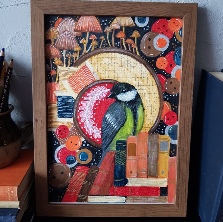 The artwork is sold framed and it can be hung or used as a bookcase or tabletop decoration to add some whimsical charm to any reading corner, office or craft room. The frame is 24cm by 32cm.